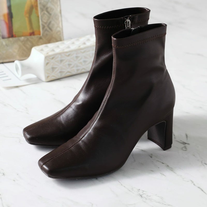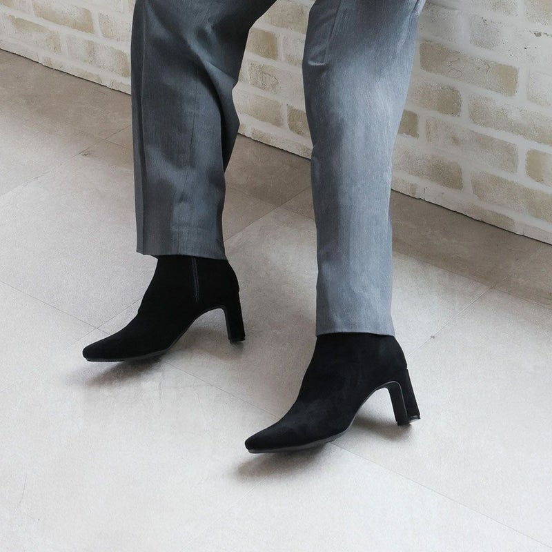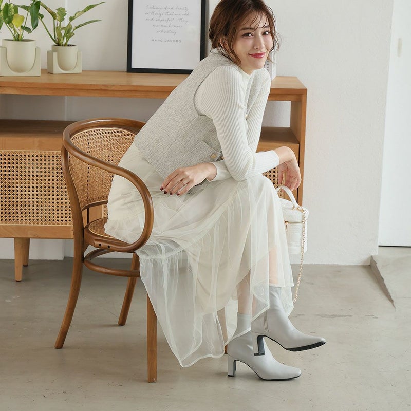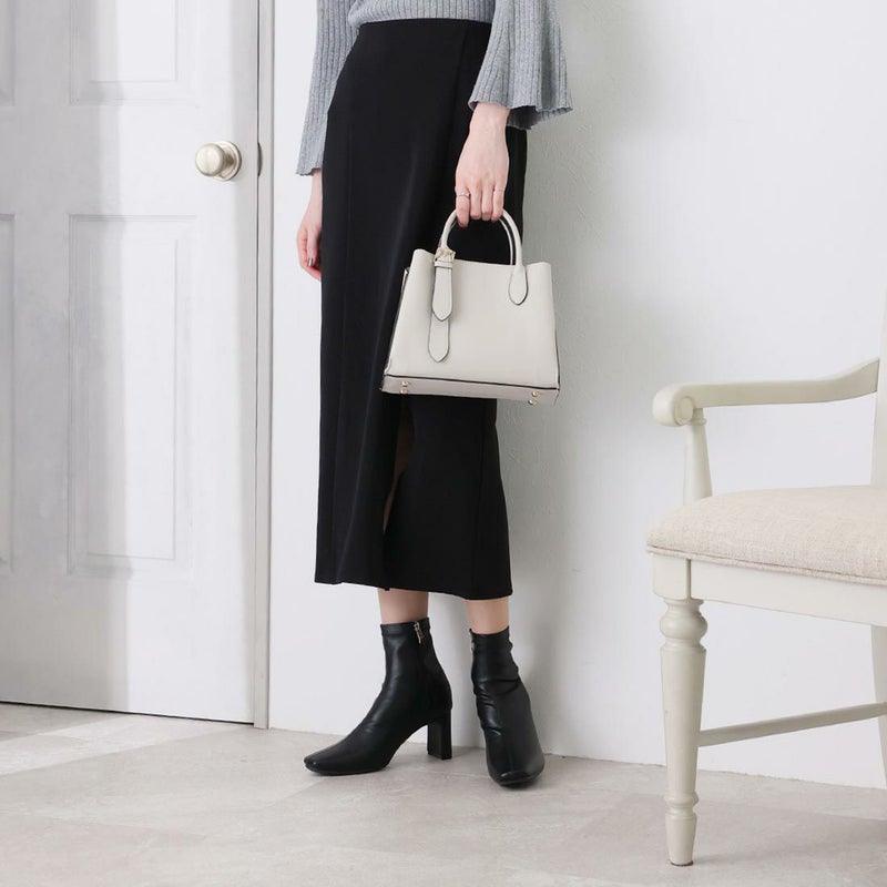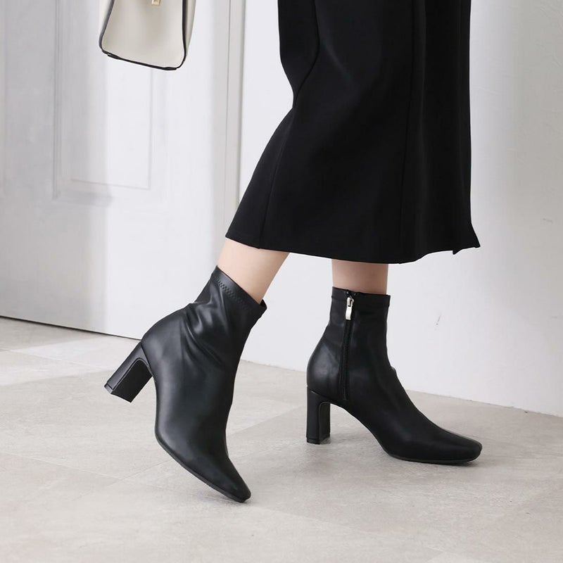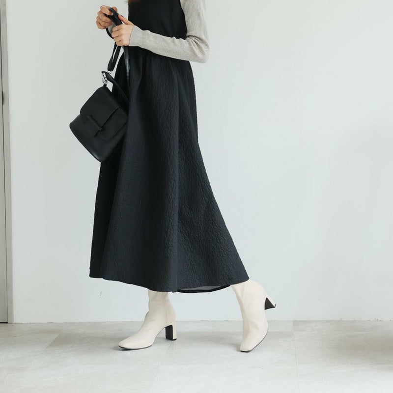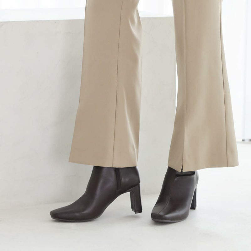 ・細めのスクエアトゥ×プレートヒールで脚をスッキリと見せてシャープさのある大人な美シルエットに。