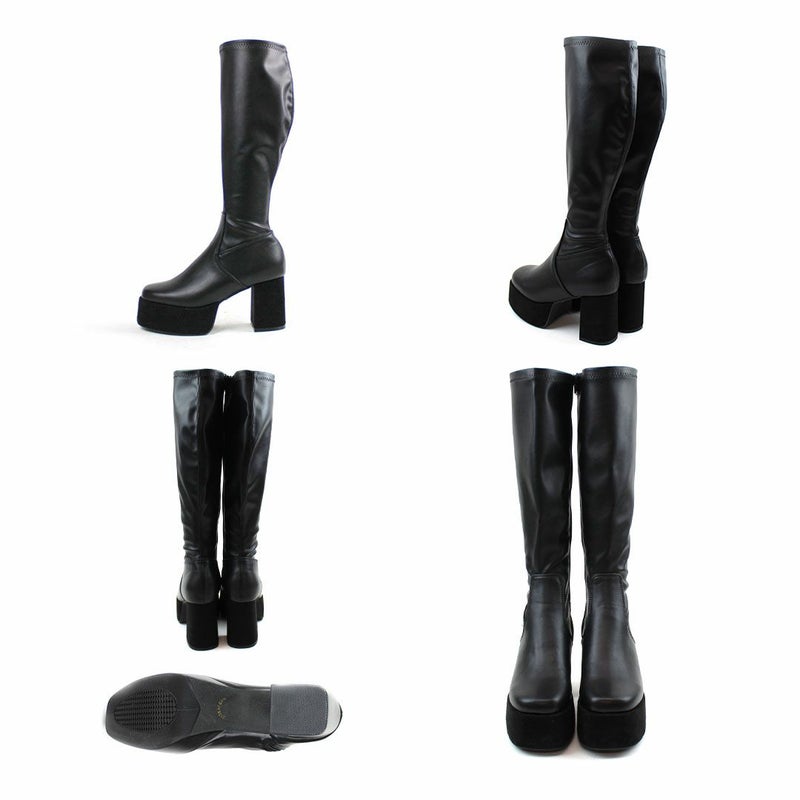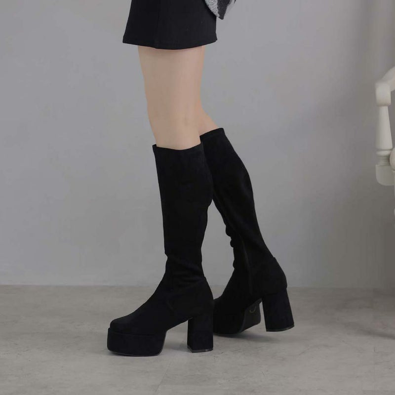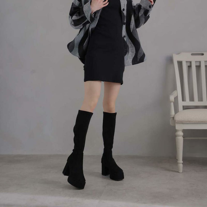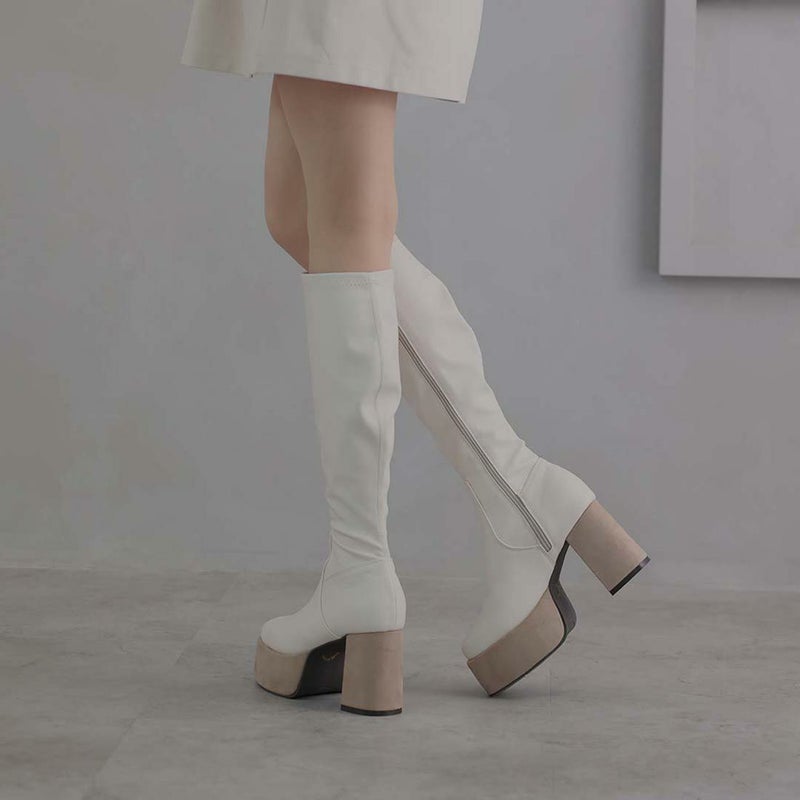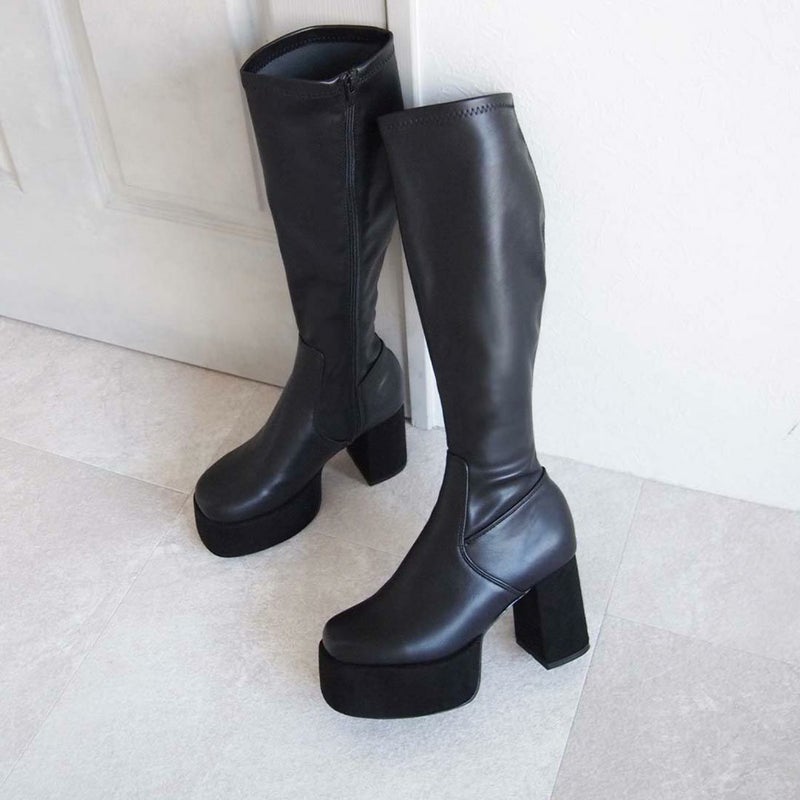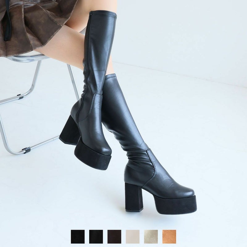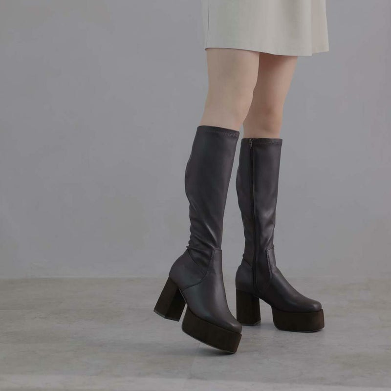 アッパーのレザーライクなストレッチ素材×厚底プラットフォーム&ヒールのスエード素材コンビで高級感をプラス。