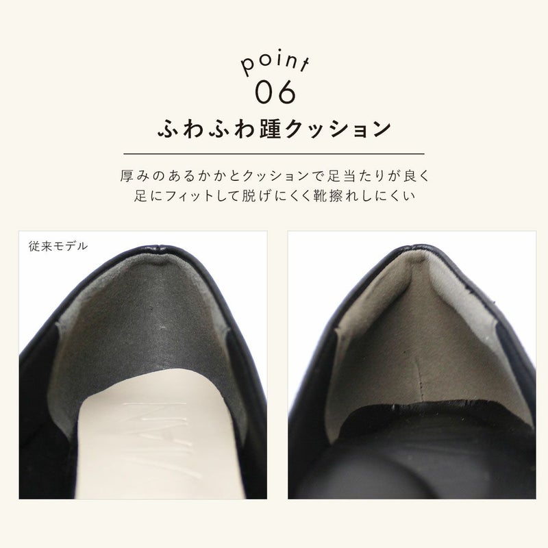 ②裏材はクッション入りの柔らかい素材で、履き口は裏地の切り端が見えない仕様で足当たりの良い履き心地