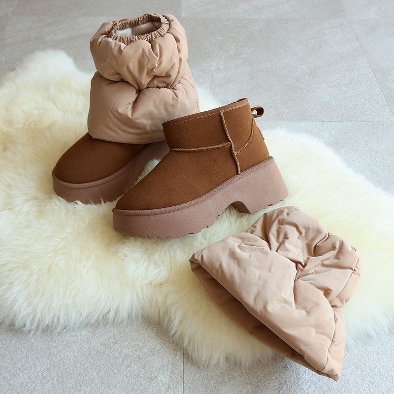 ・キルティングは取り外し可能なブーツカバーで、通常のブーツのように使える1足2役の遊べるモンスターブーツ。履けるダウンを着せ替え感覚でコーデに合わせて雰囲気チェンジもできる。