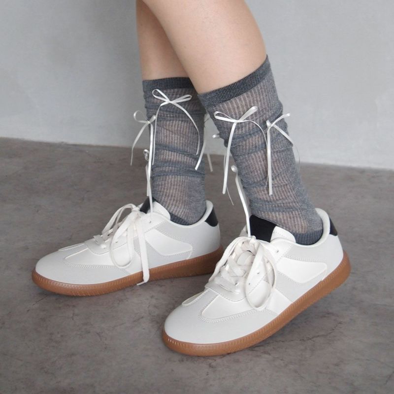 ・ゴツめのローファーやバレエシューズ、厚底スニーカー、トレンドのメタリックカラーやパンプスと合わせてコーデのアクセントに。