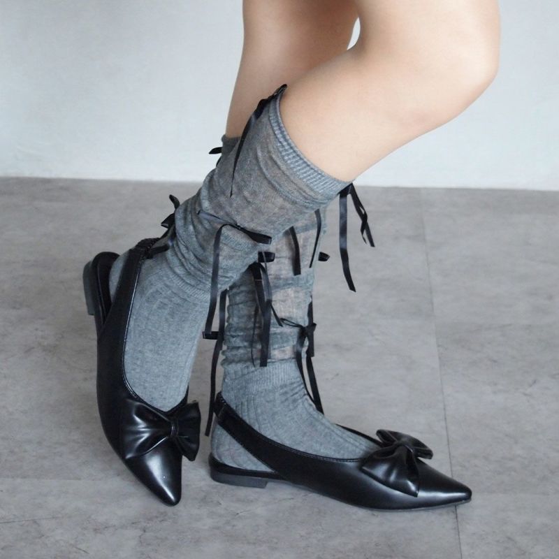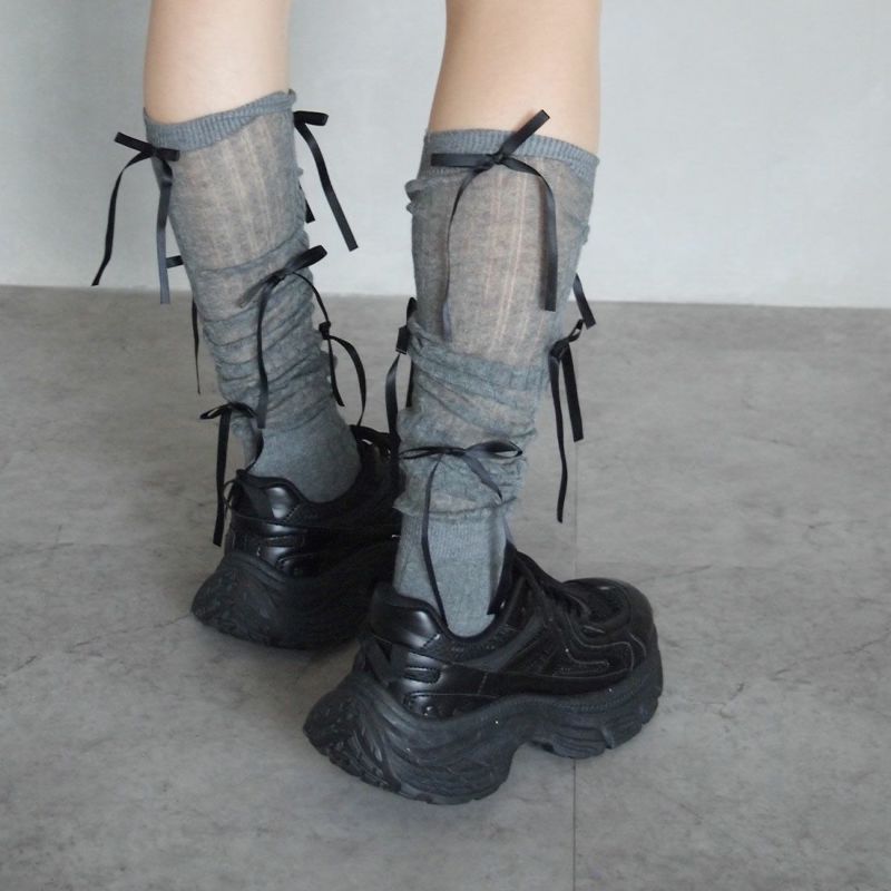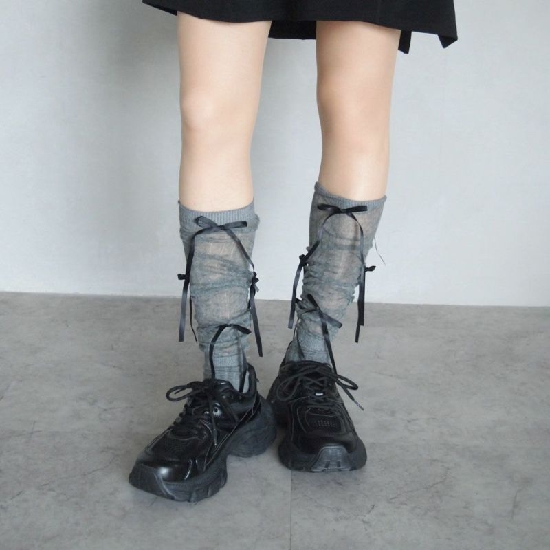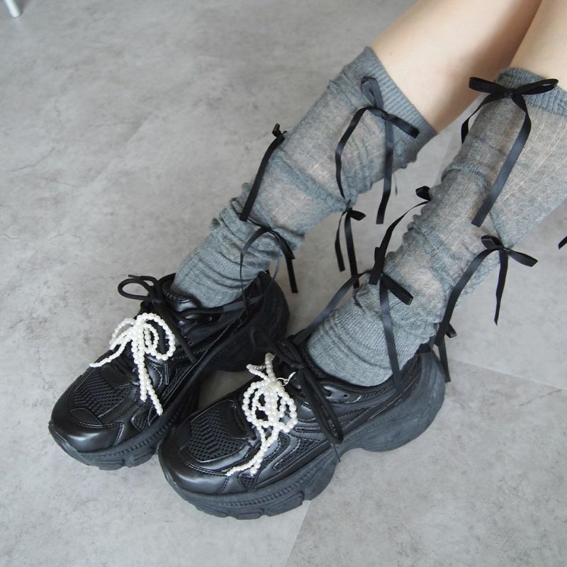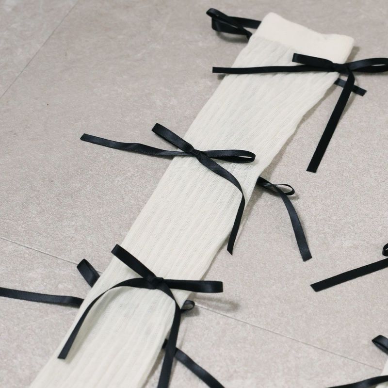 ・韓国トレンドの長めなサテンリボンがポイントのニーハイソックス!