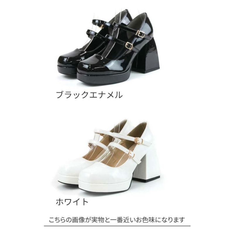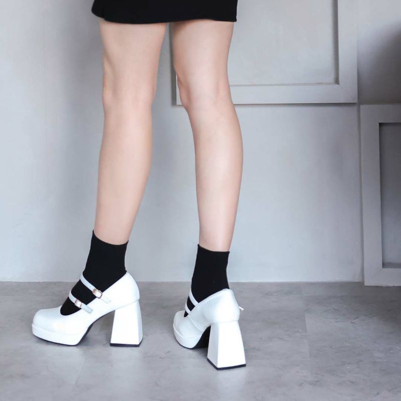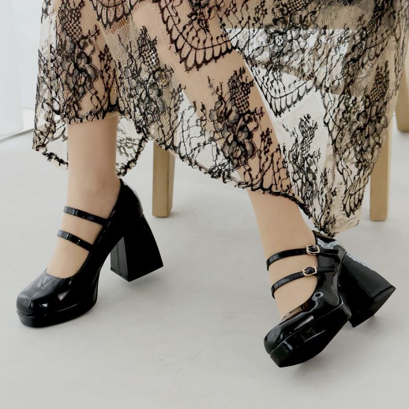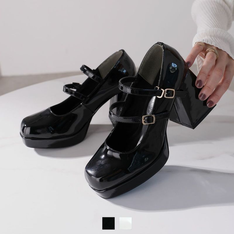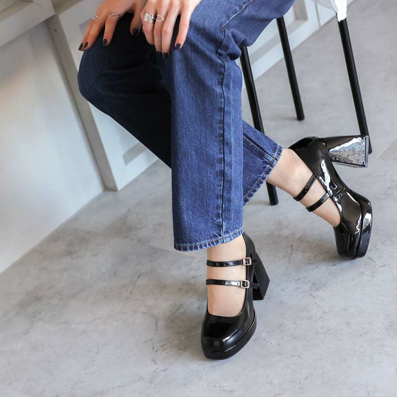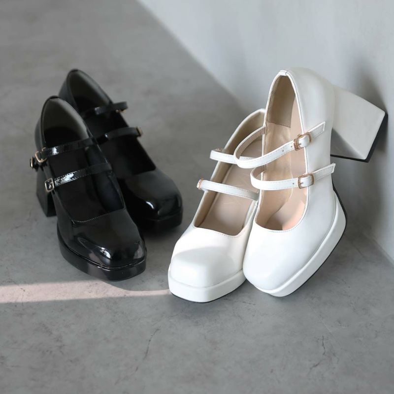 ・ダブルストラップとコロンとしたソフトスクエアトゥでレディライクな足元を演出