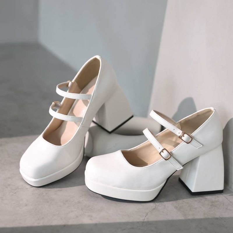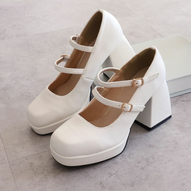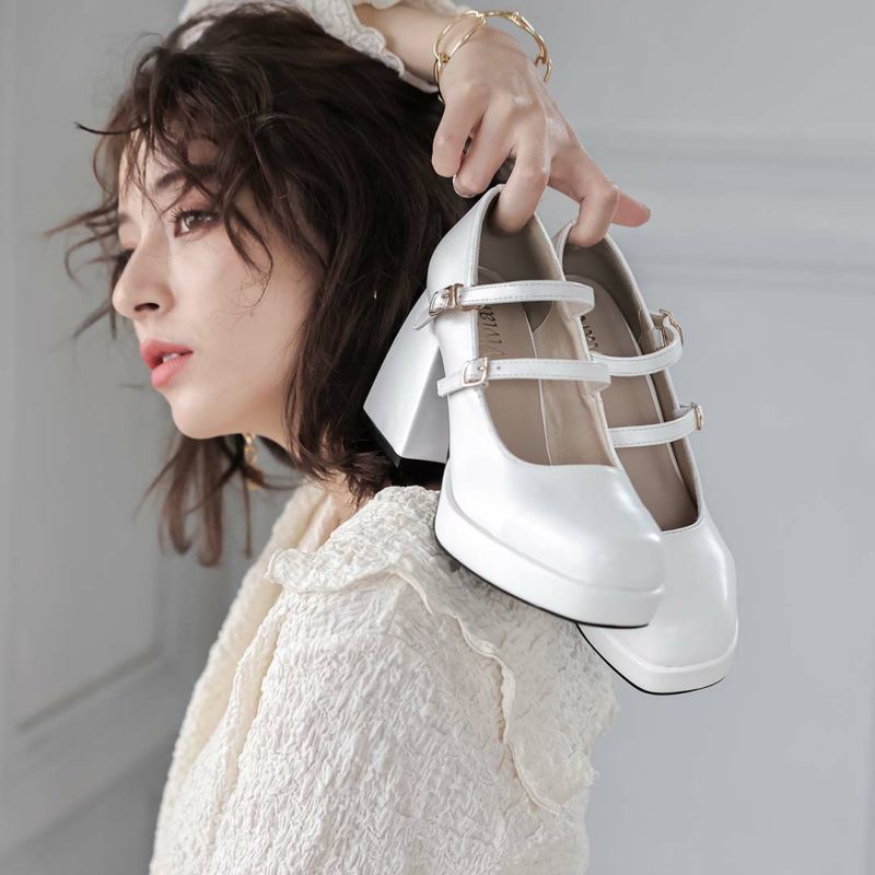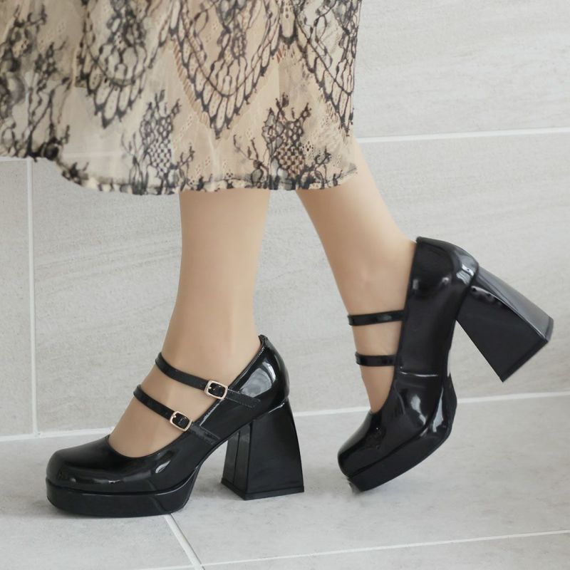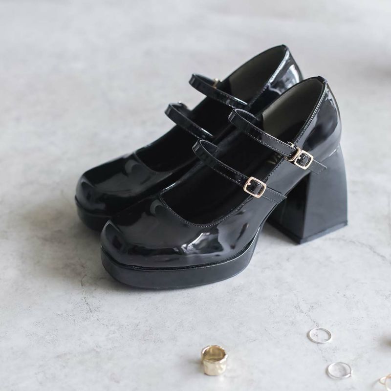 ・ダブルストラップとコロンとしたソフトスクエアトゥでレディライクな足元を演出