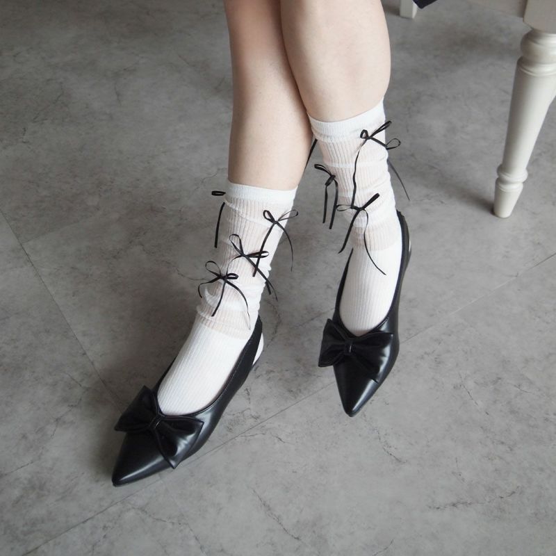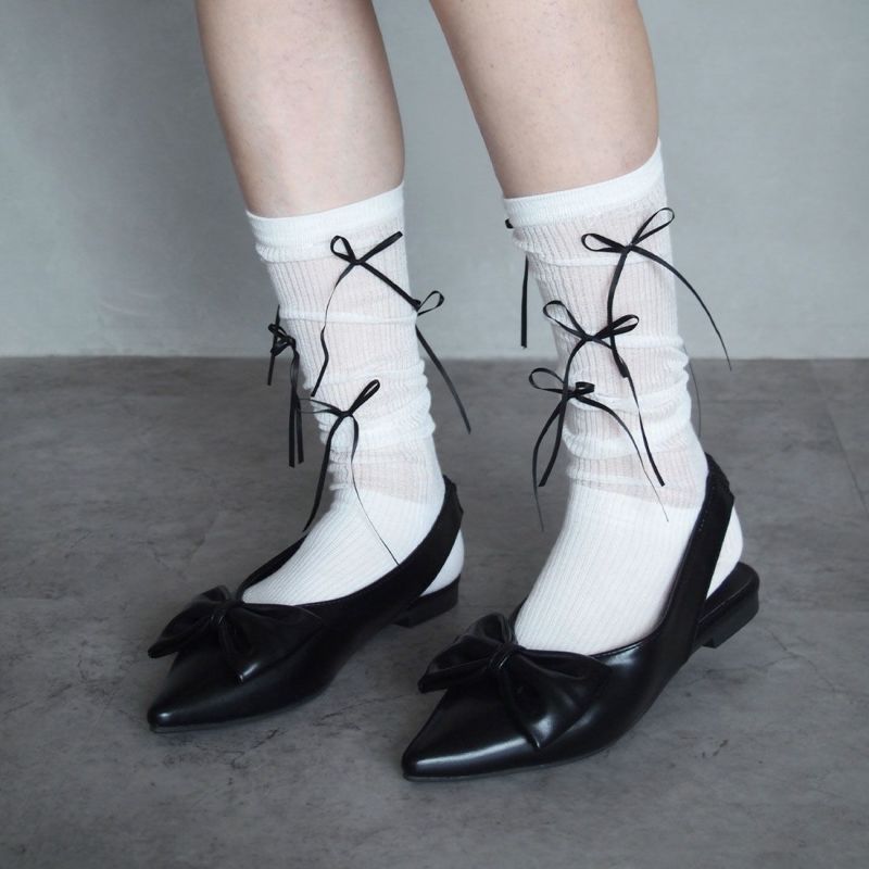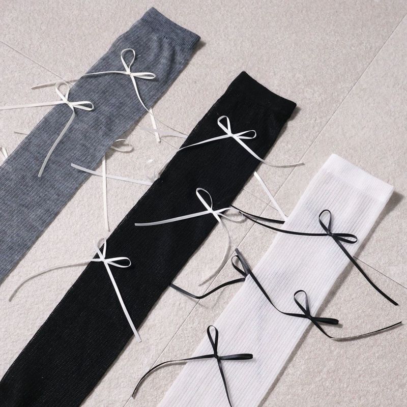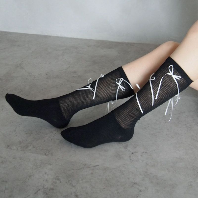 ・韓国トレンドの長めなサテンリボンがポイントのハイソックス!