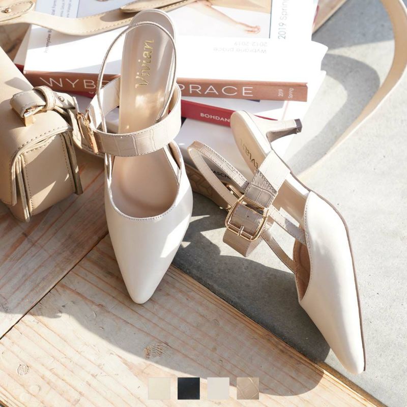 ・太ベルト×華奢バックストラップの対照的な組み合わせがモードでエレガントなパンプス。