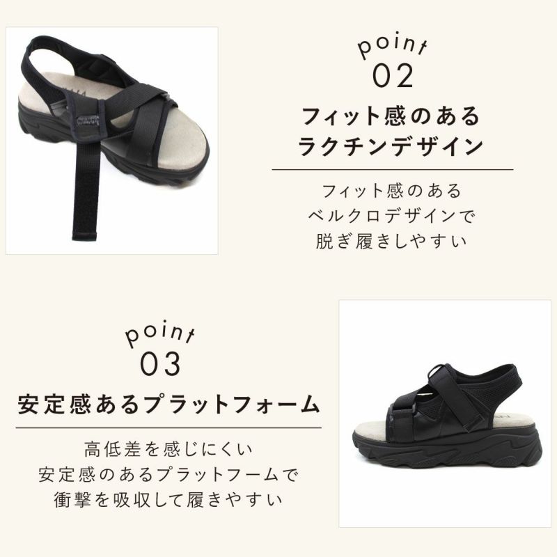 ・フィット感のあるベルクロデザインで脱ぎ履きしやすいラクチンデザイン