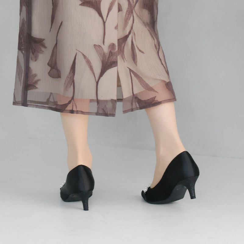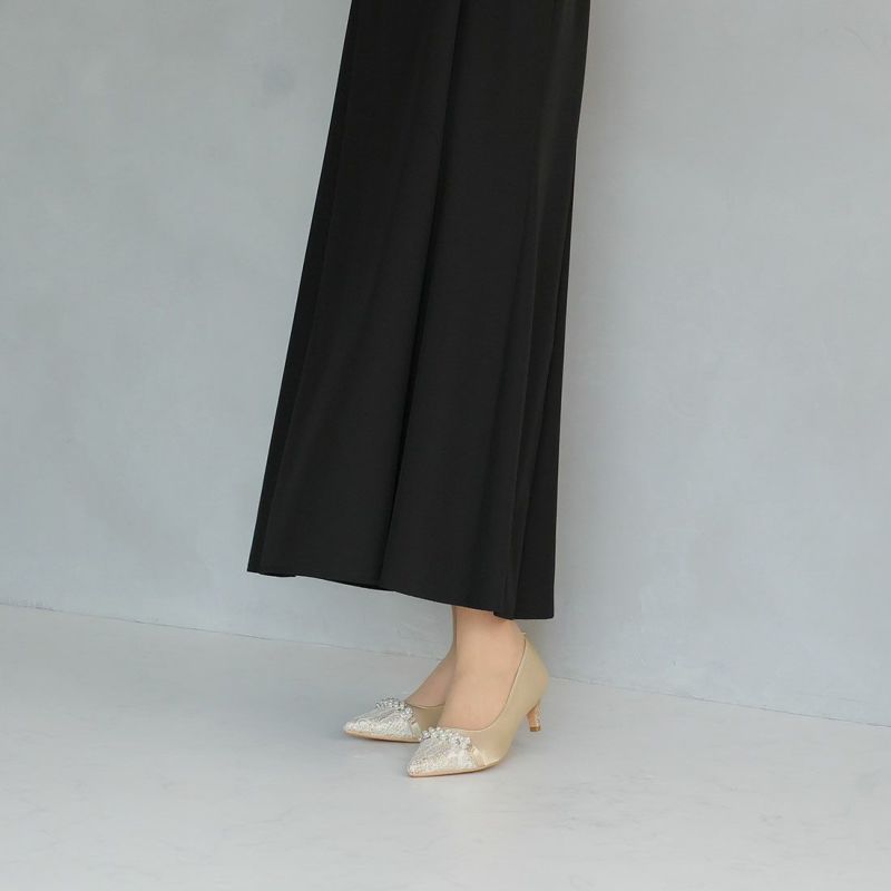 ・光沢のあるサテンとグリッターヒールで後ろ姿まで隙のない素敵コーデに。