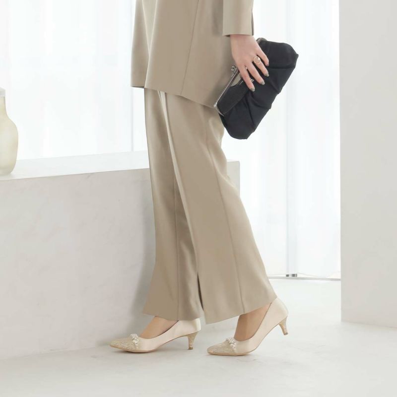 ・光沢のあるサテンとグリッターヒールで後ろ姿まで隙のない素敵コーデに。