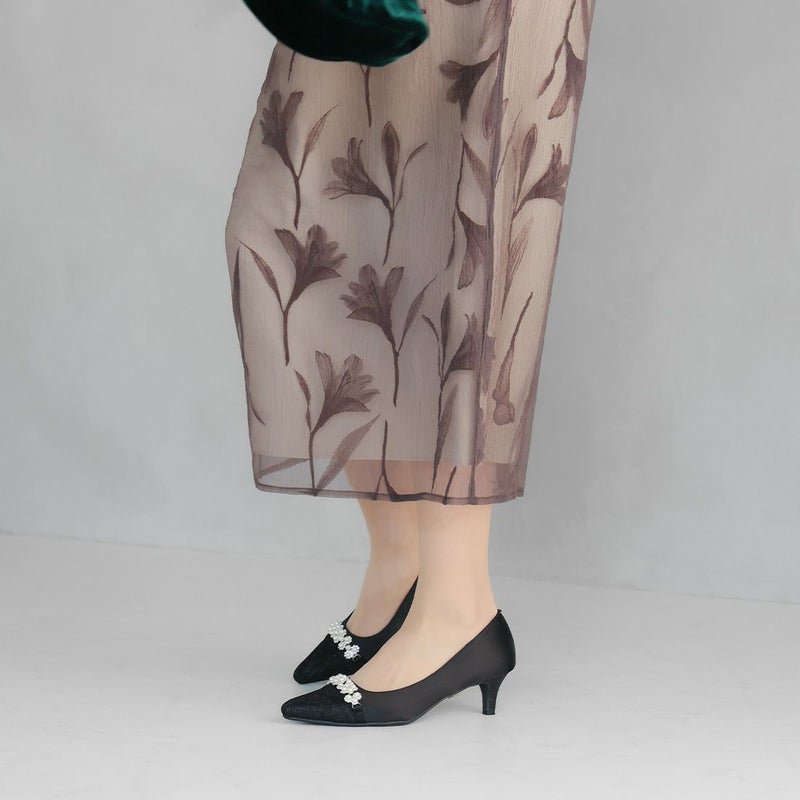 ・光沢のあるサテンとグリッターヒールで後ろ姿まで隙のない素敵コーデに。