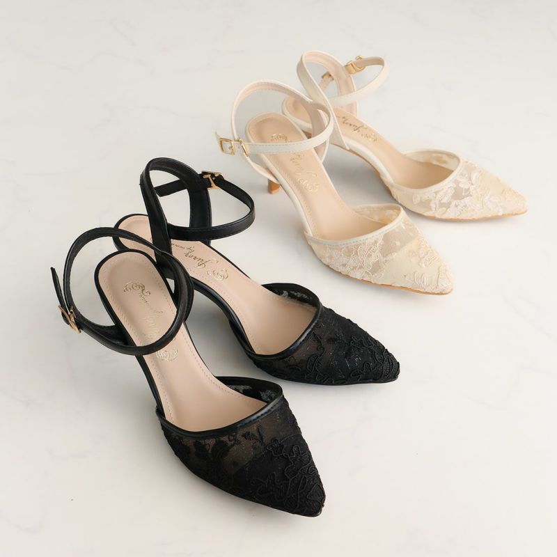 jurer シアーチュールレースグリッターヒールストラップパンプス