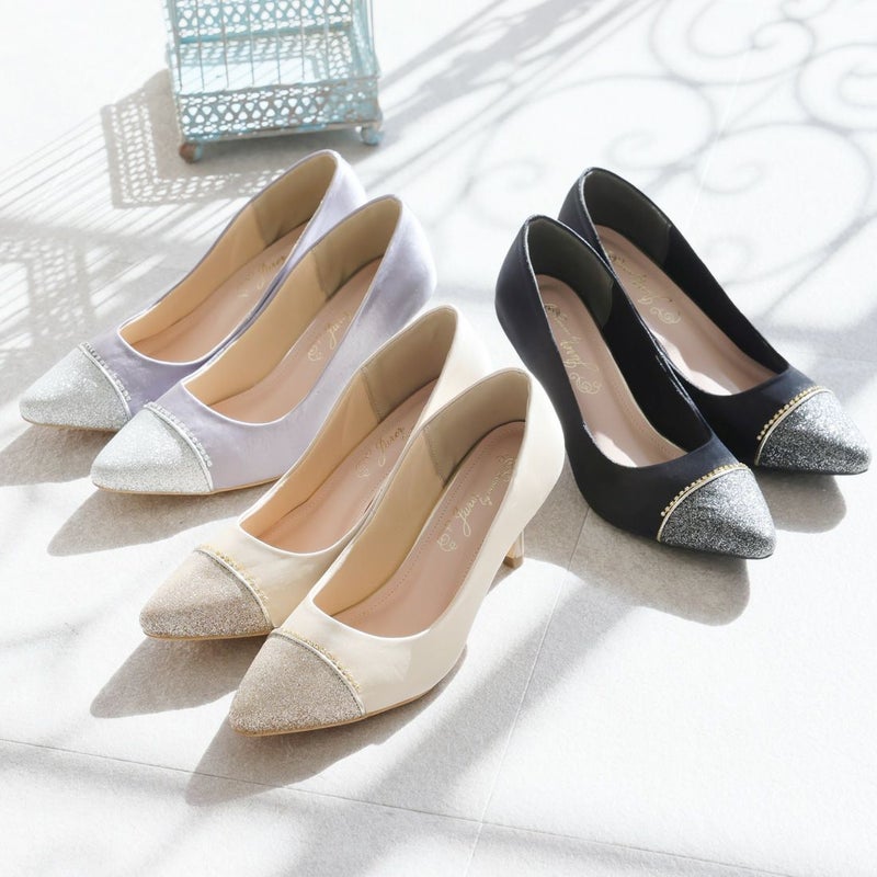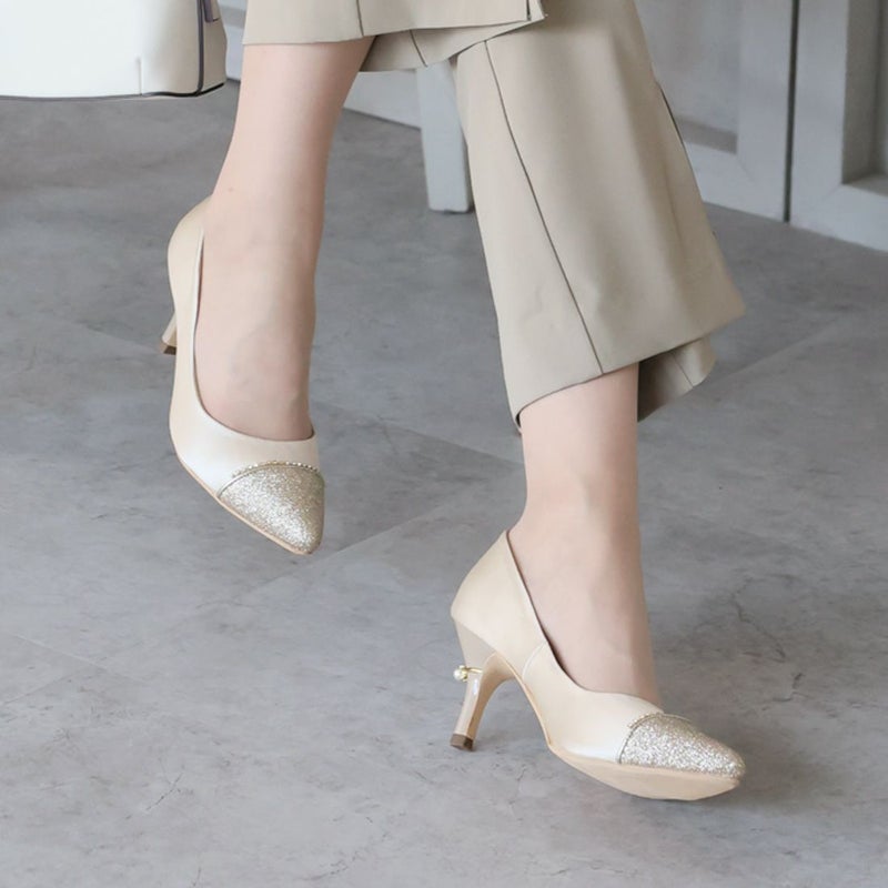 ・ラグジュアリー感漂うグリッター素材&パールリング付きヒールで後ろ姿まで隙のない素敵コーデに。