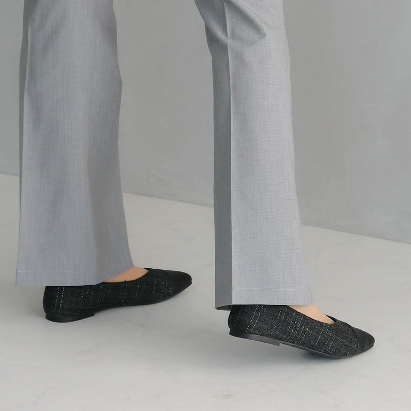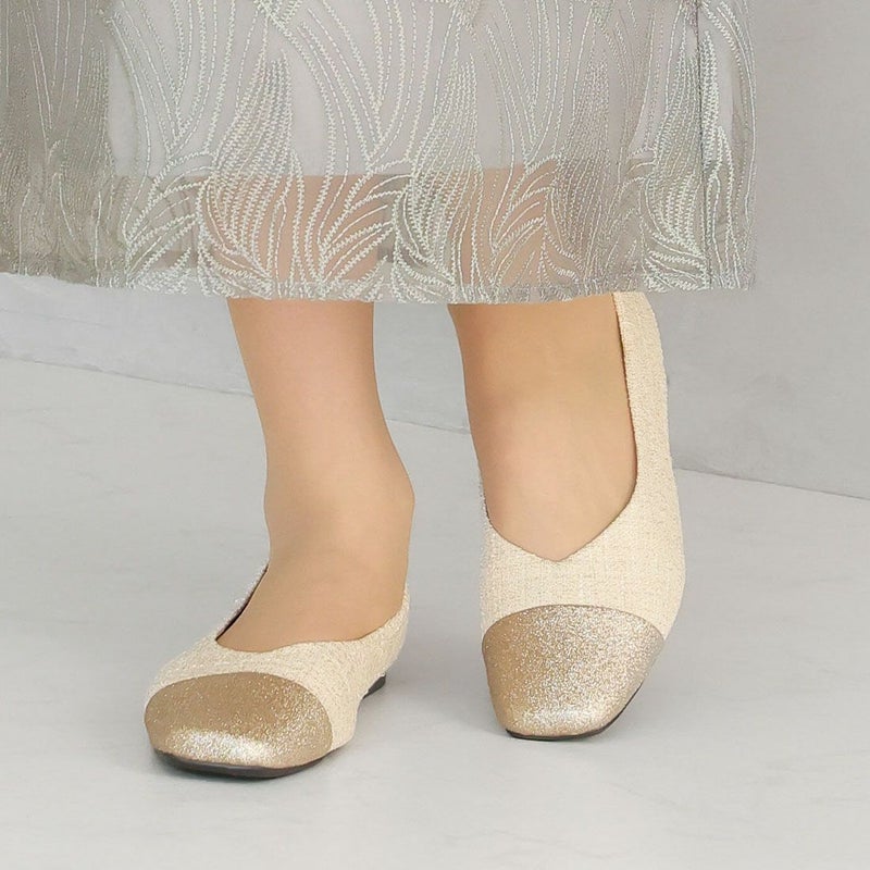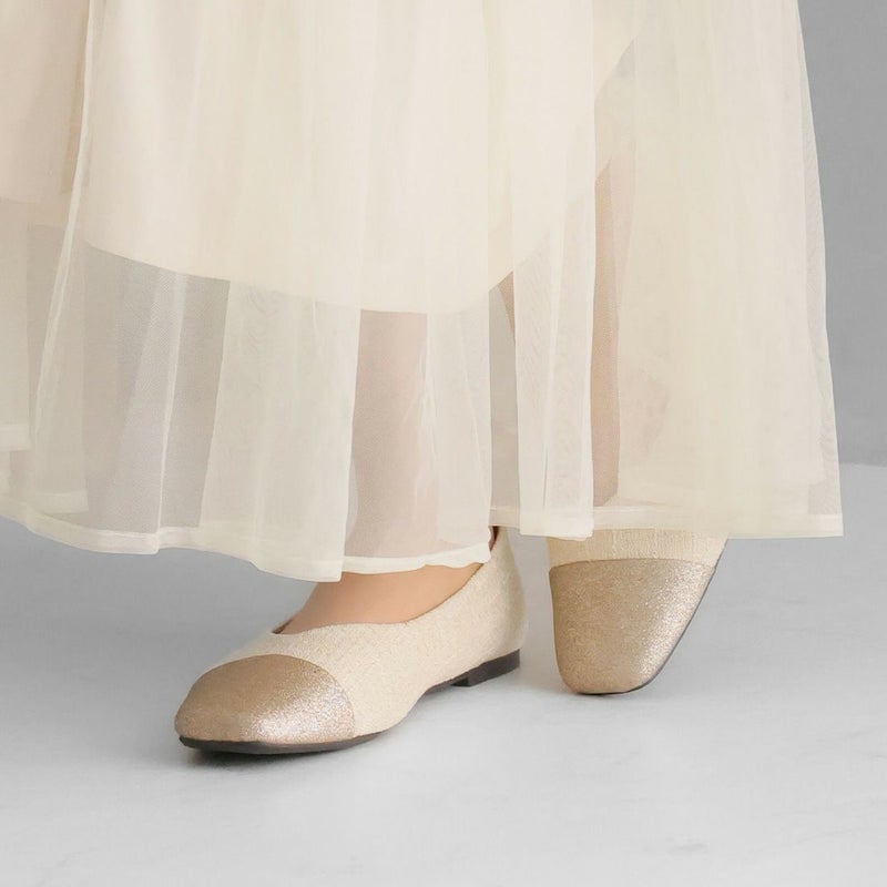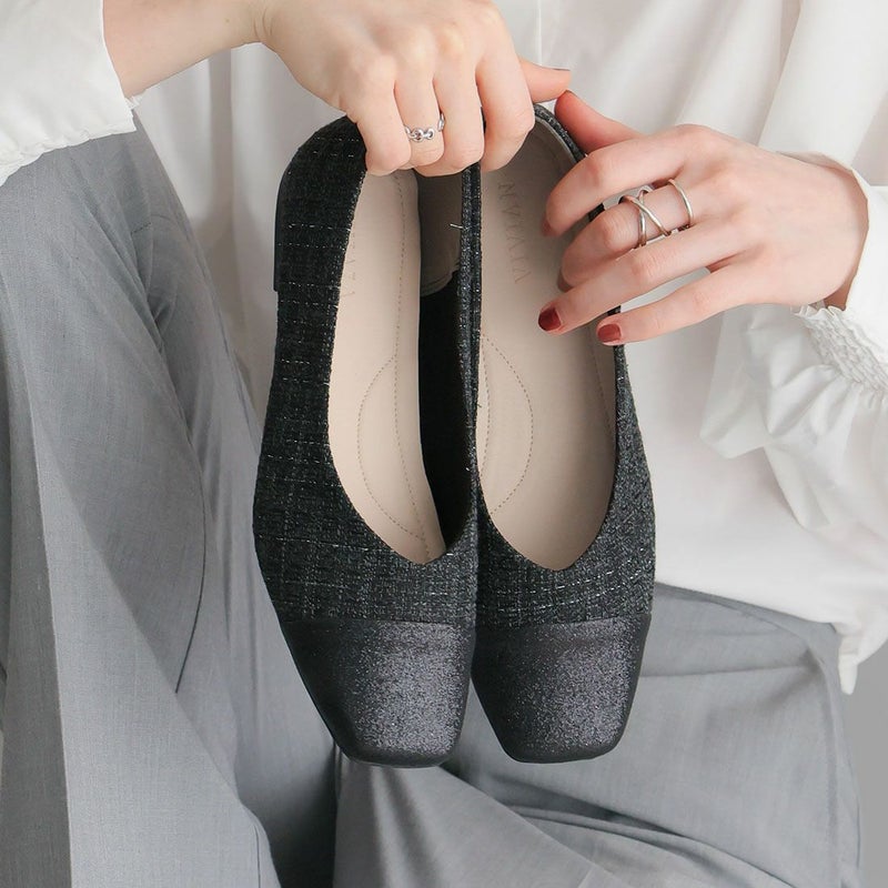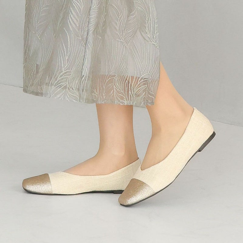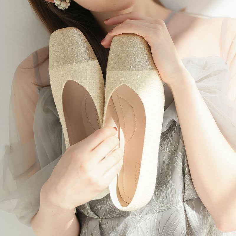 ・キラキラのグリッター×上品なラメ糸入りツイードがアクセサリー感覚で履ける!異素材の切り替えデザインがポイントのフラットパンプス!