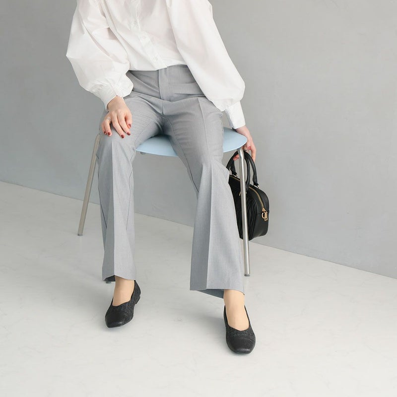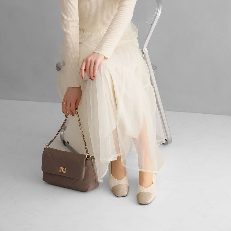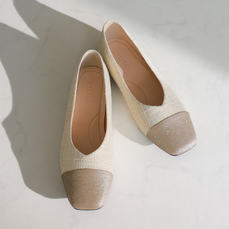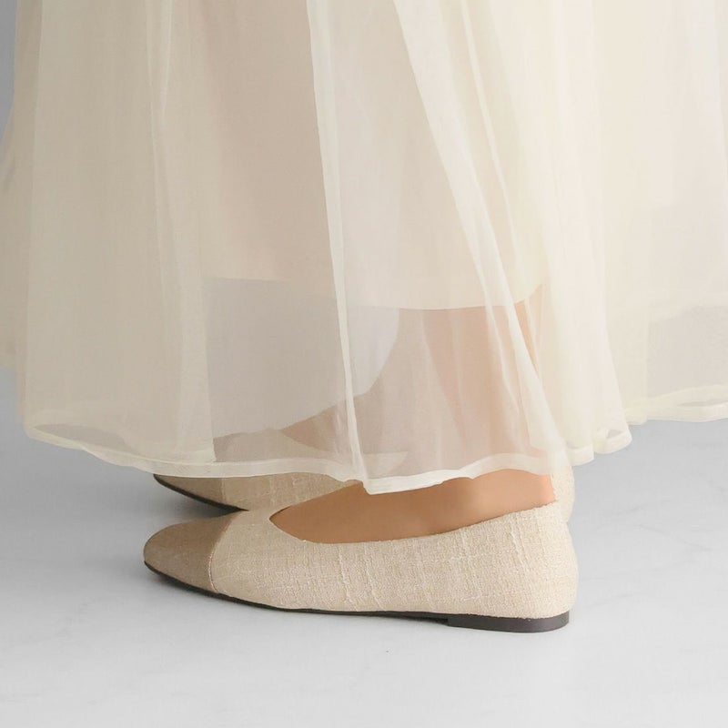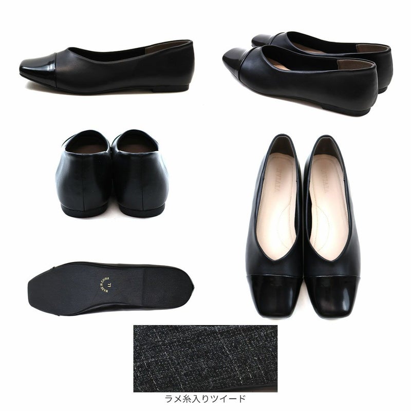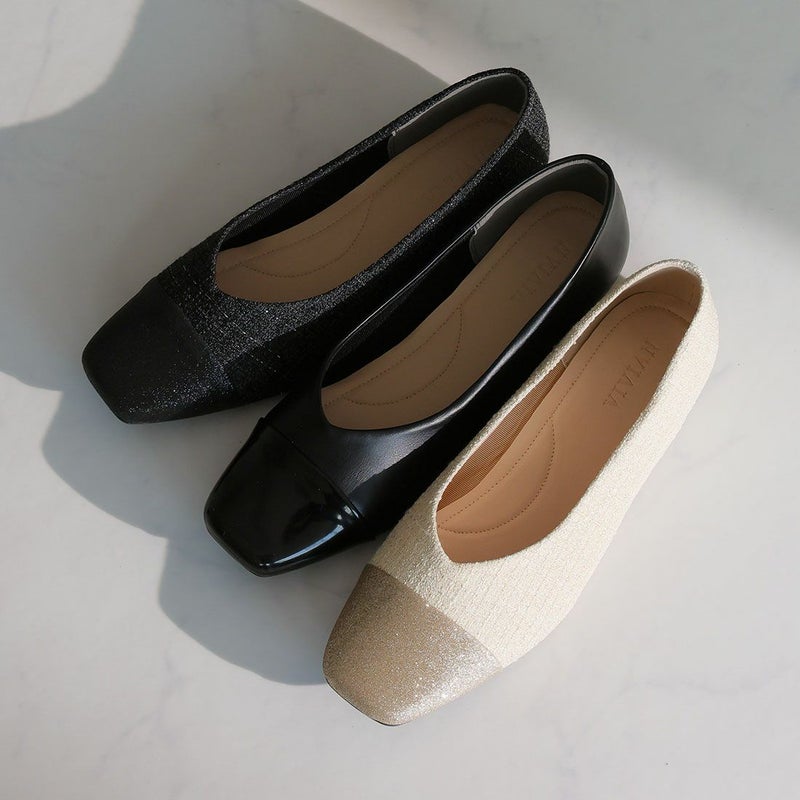 ・キラキラのグリッター×上品なラメ糸入りツイードがアクセサリー感覚で履ける!異素材の切り替えデザインがポイントのフラットパンプス!