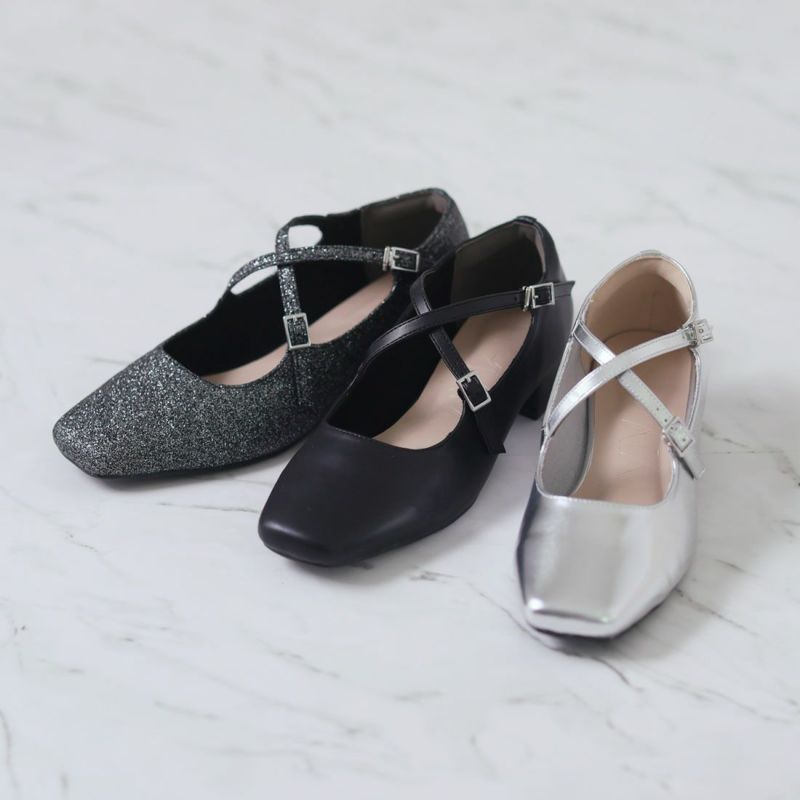 ・クロスストラップとコロンとしたソフトスクエアトゥでレディライクな足元を演出