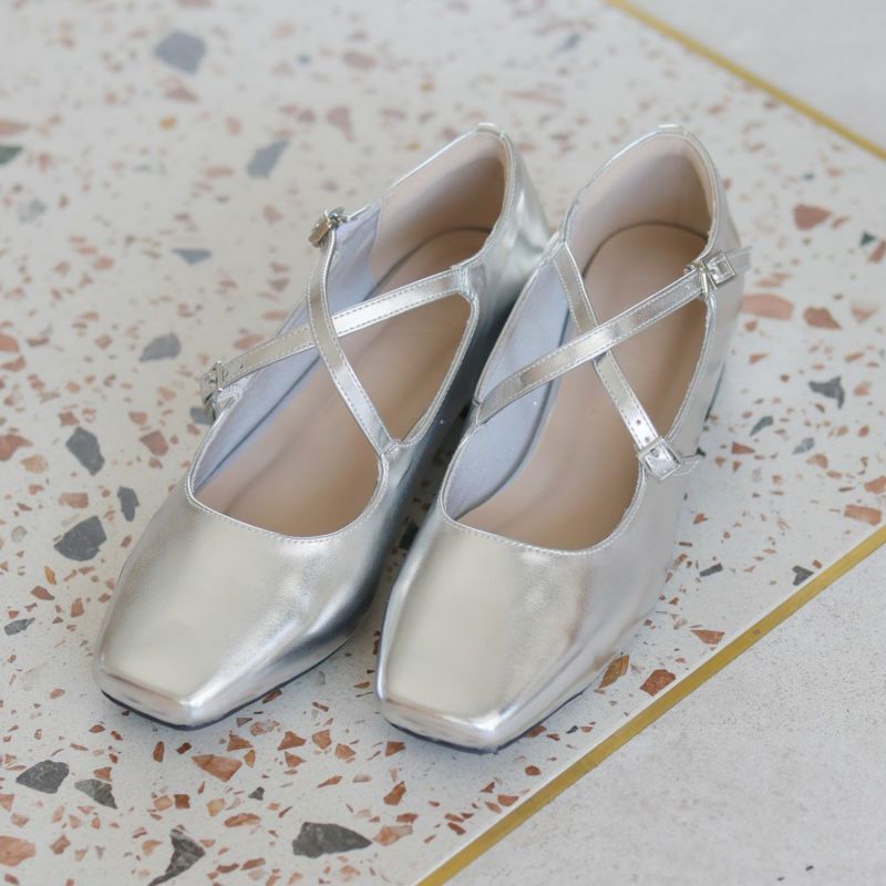 ・クロスストラップとコロンとしたソフトスクエアトゥでレディライクな足元を演出