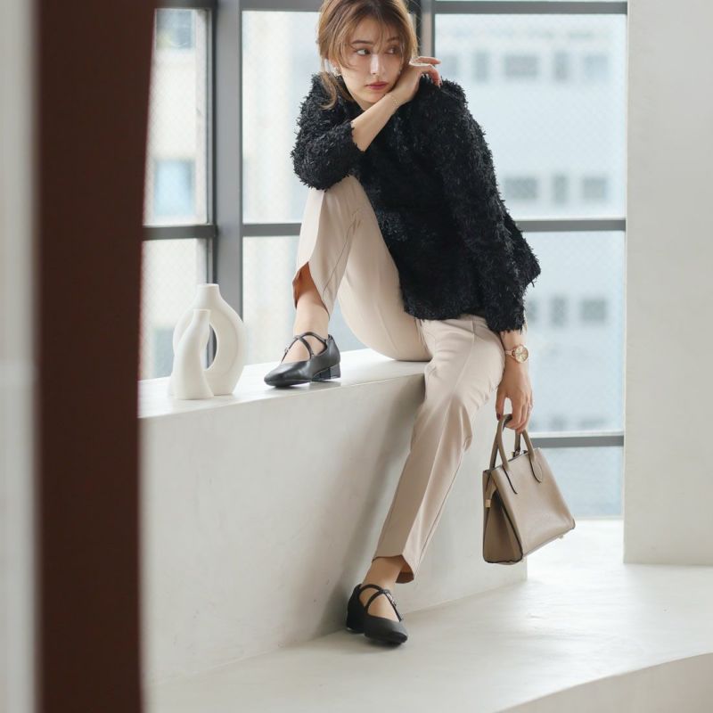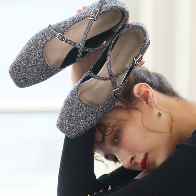 ・クロスストラップとコロンとしたソフトスクエアトゥでレディライクな足元を演出