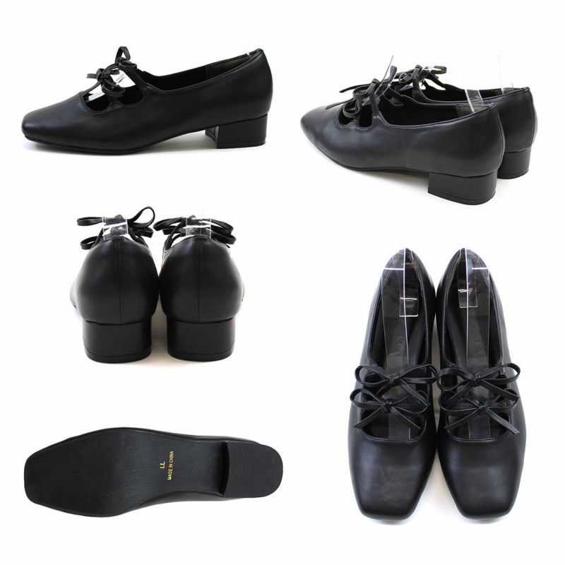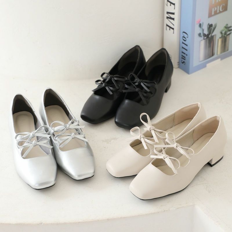 ・ダブルリボンとコロンとしたソフトスクエアトゥでレディライクな足元を演出