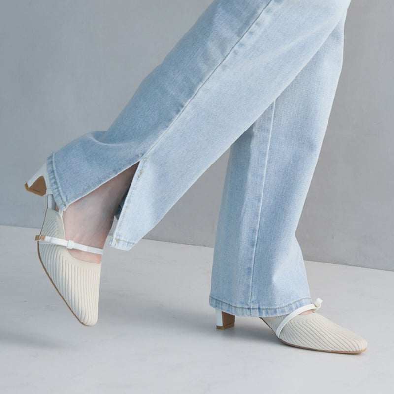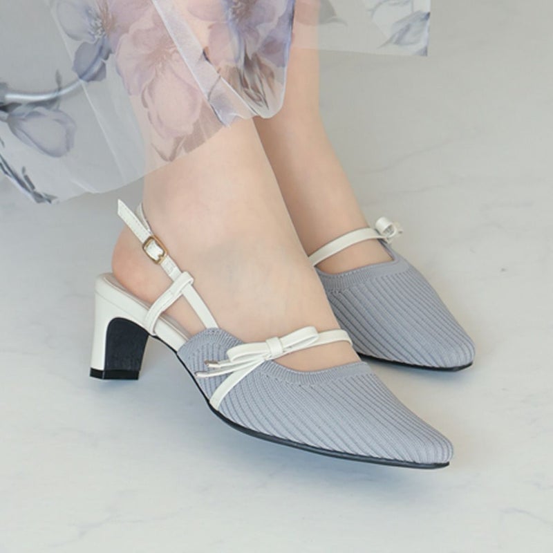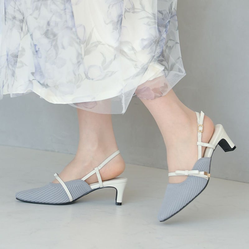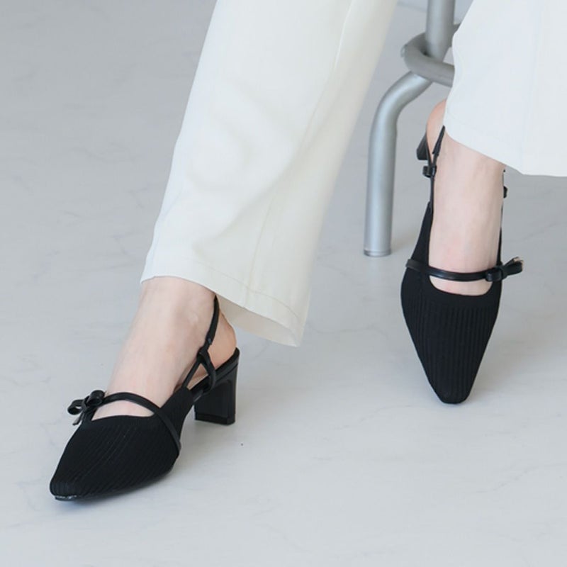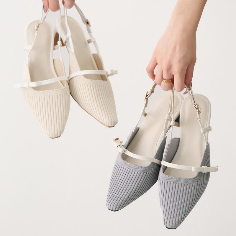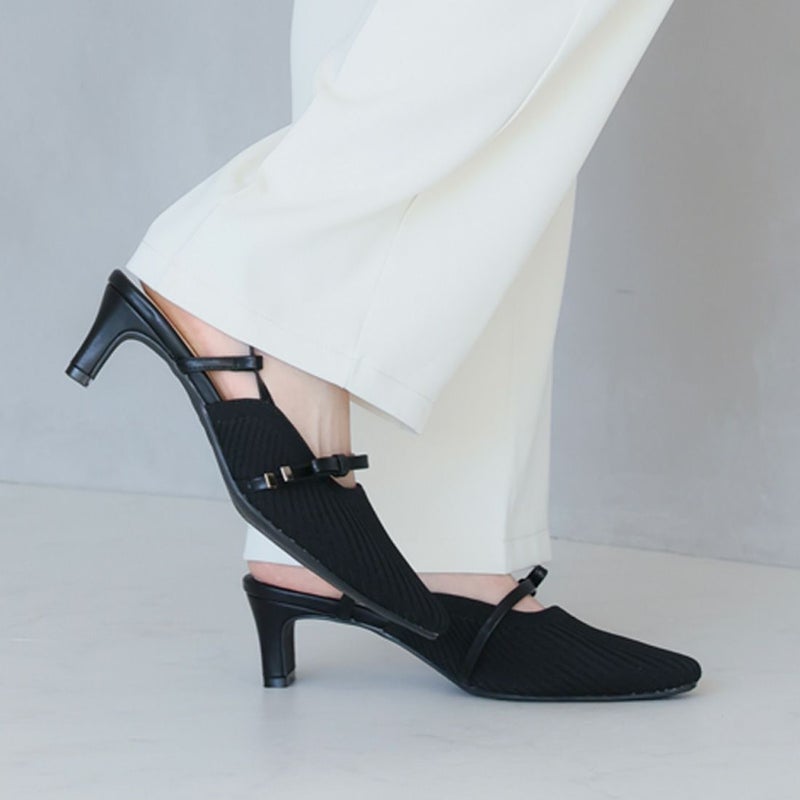 大人かわいいサイドのストラップリボンがアクセントのリブニットスリングバックパンプス!