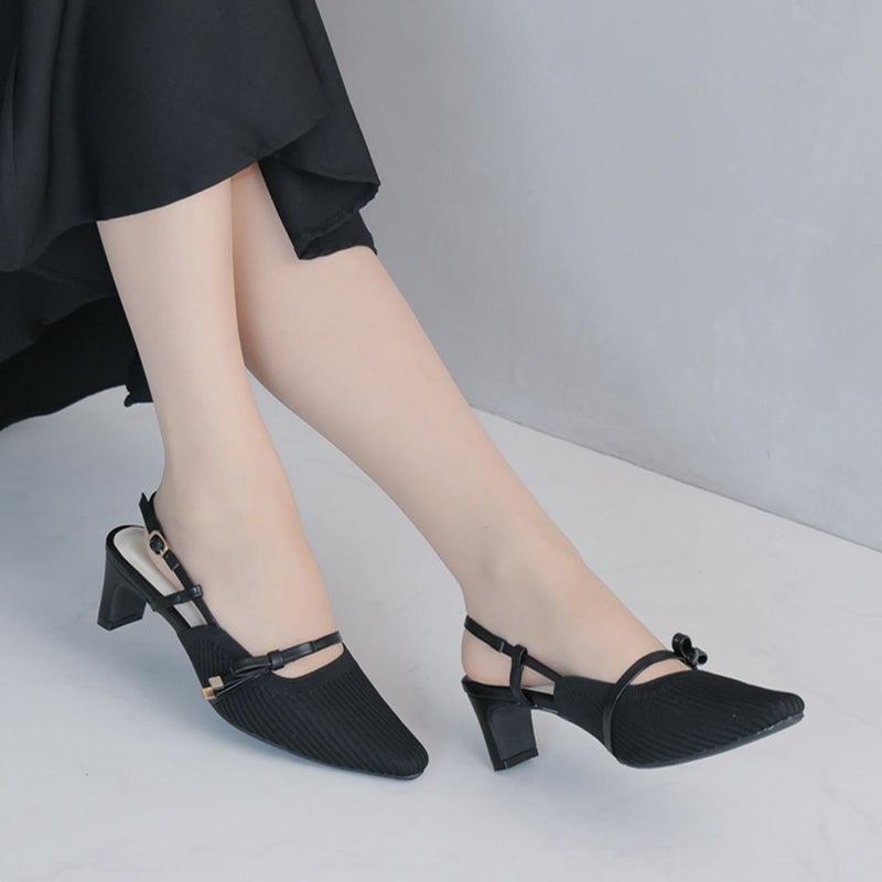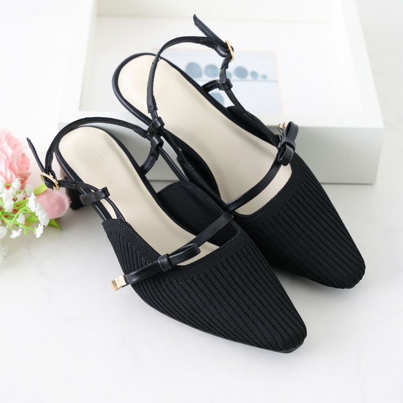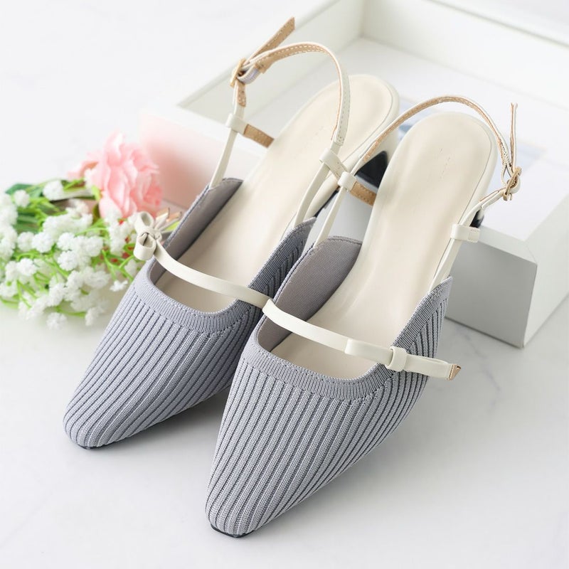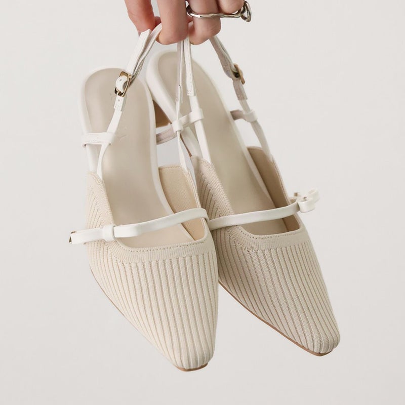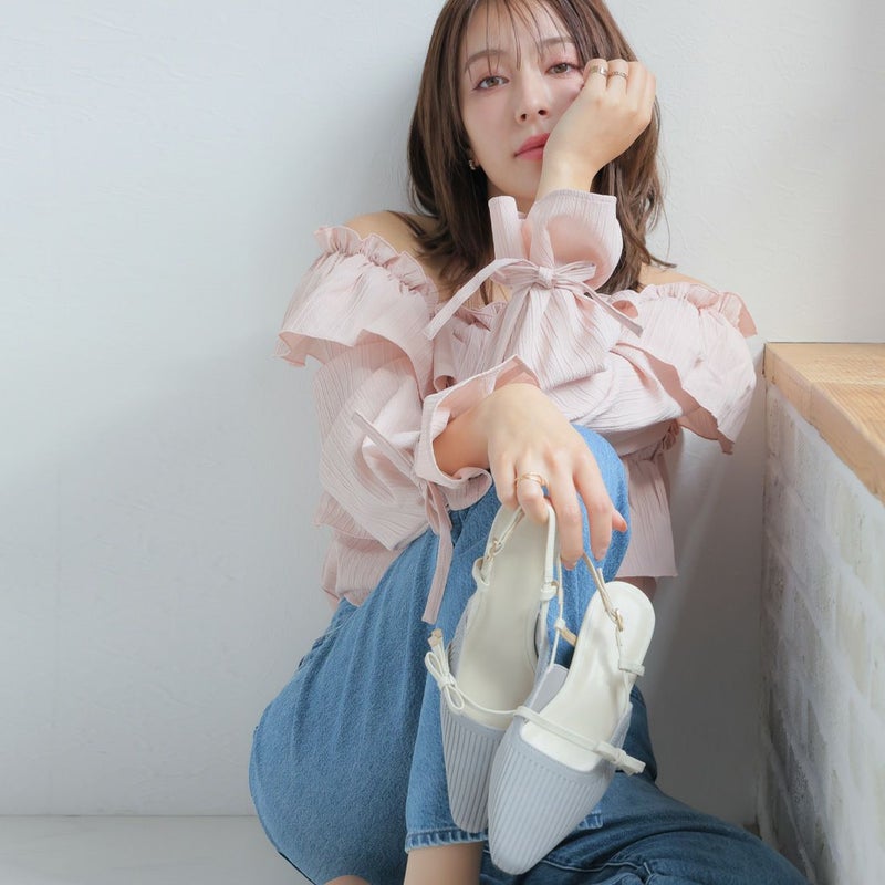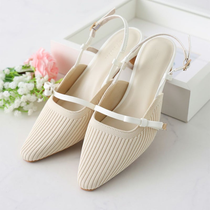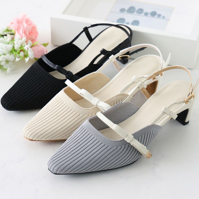 大人かわいいサイドのストラップリボンがアクセントのリブニットスリングバックパンプス!