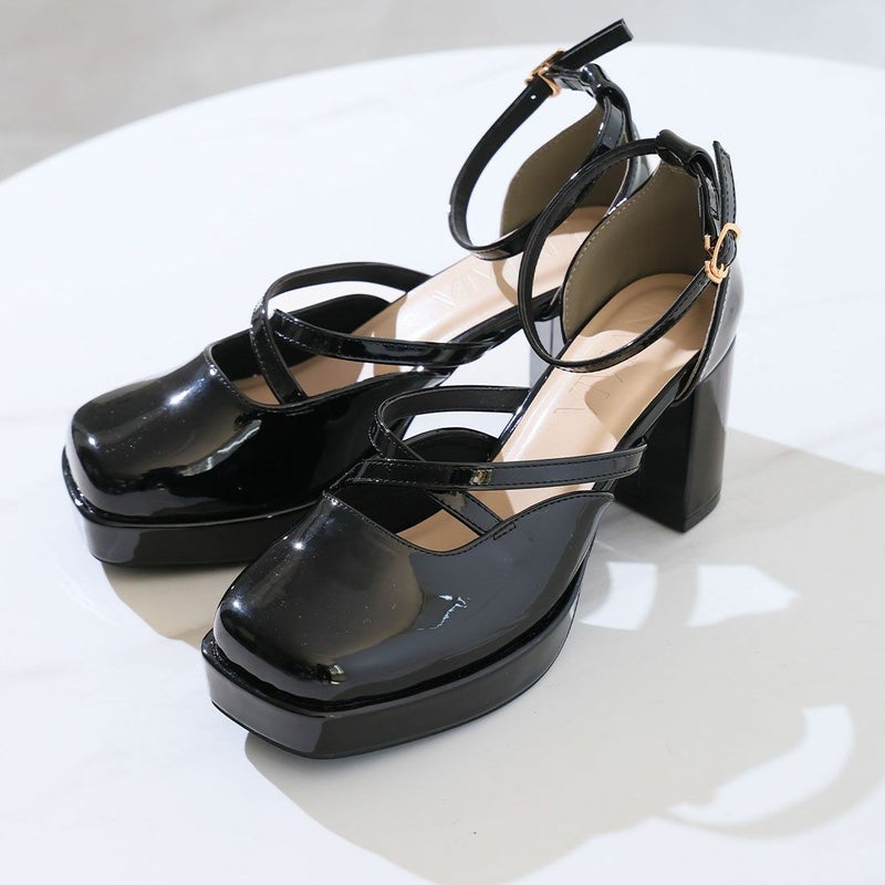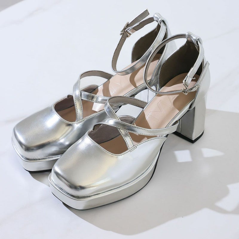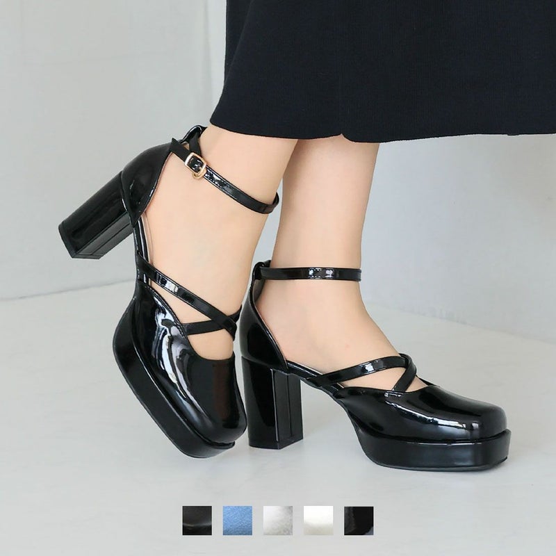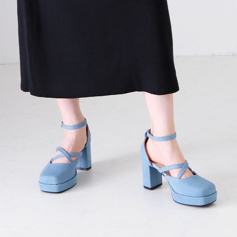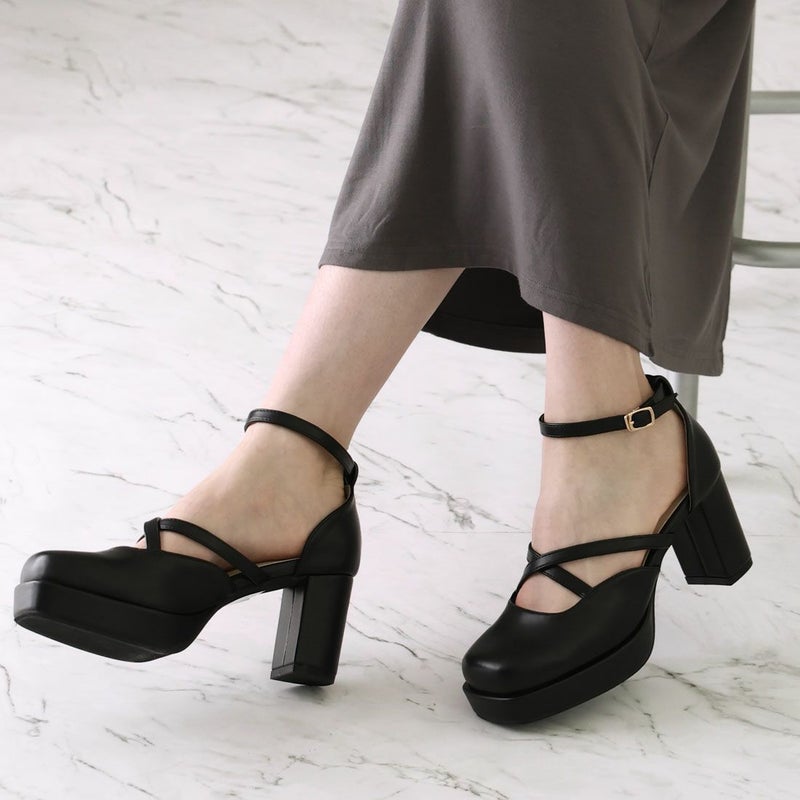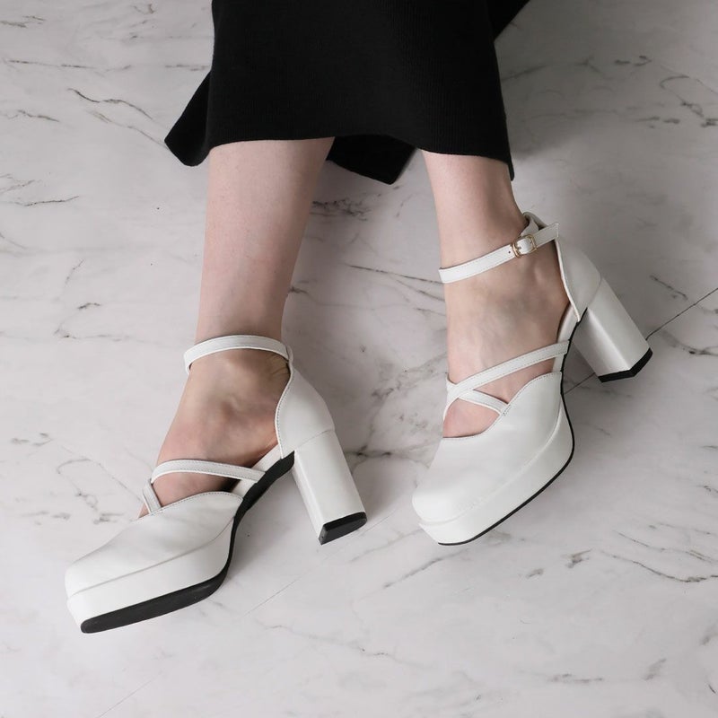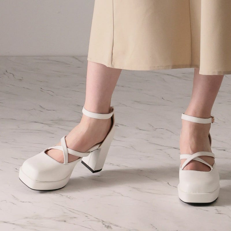 ・クロスストラップとコロンとしたソフトスクエアトゥでレディライクな足元を演出