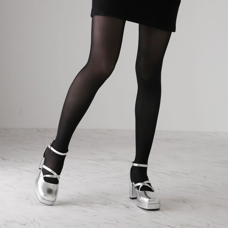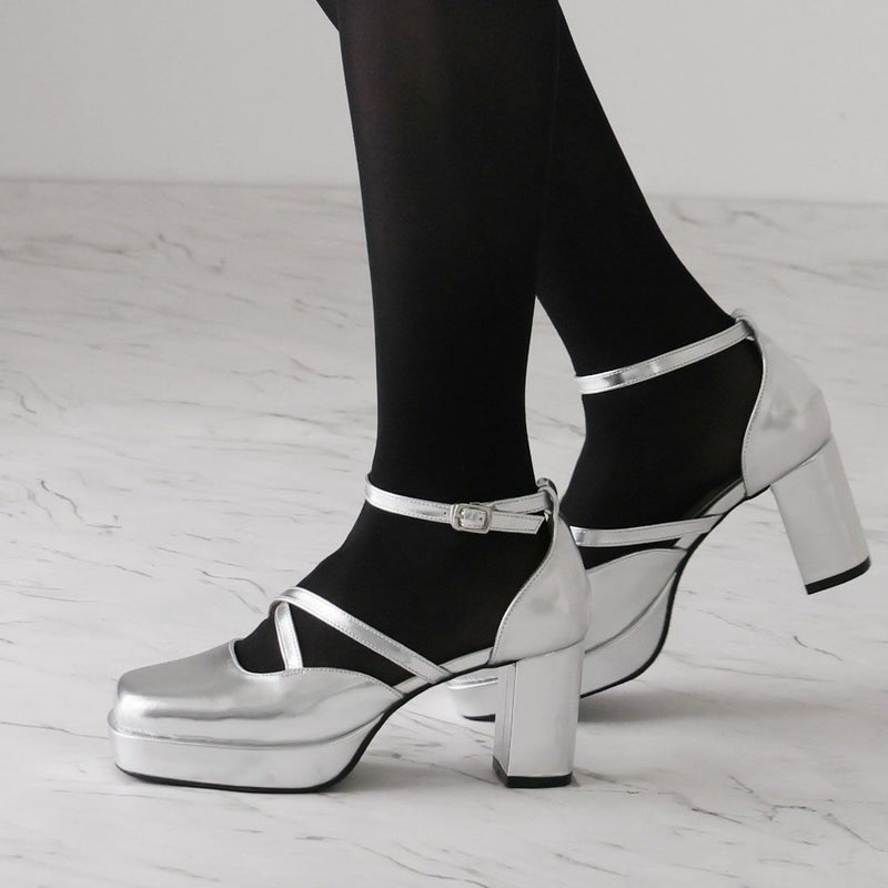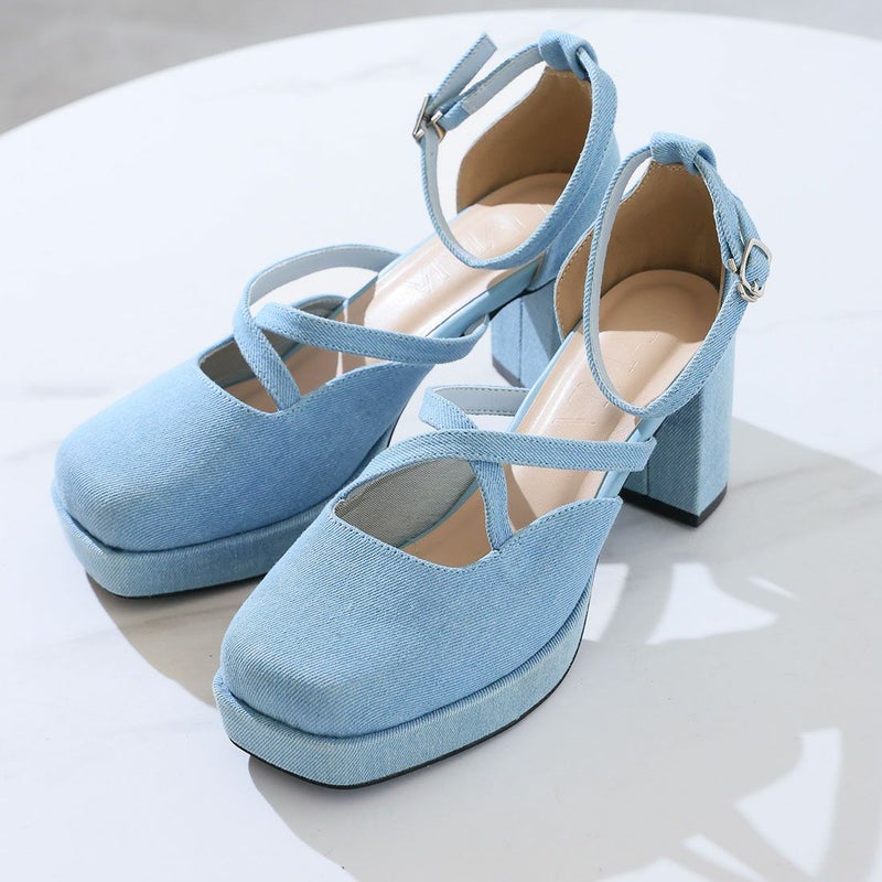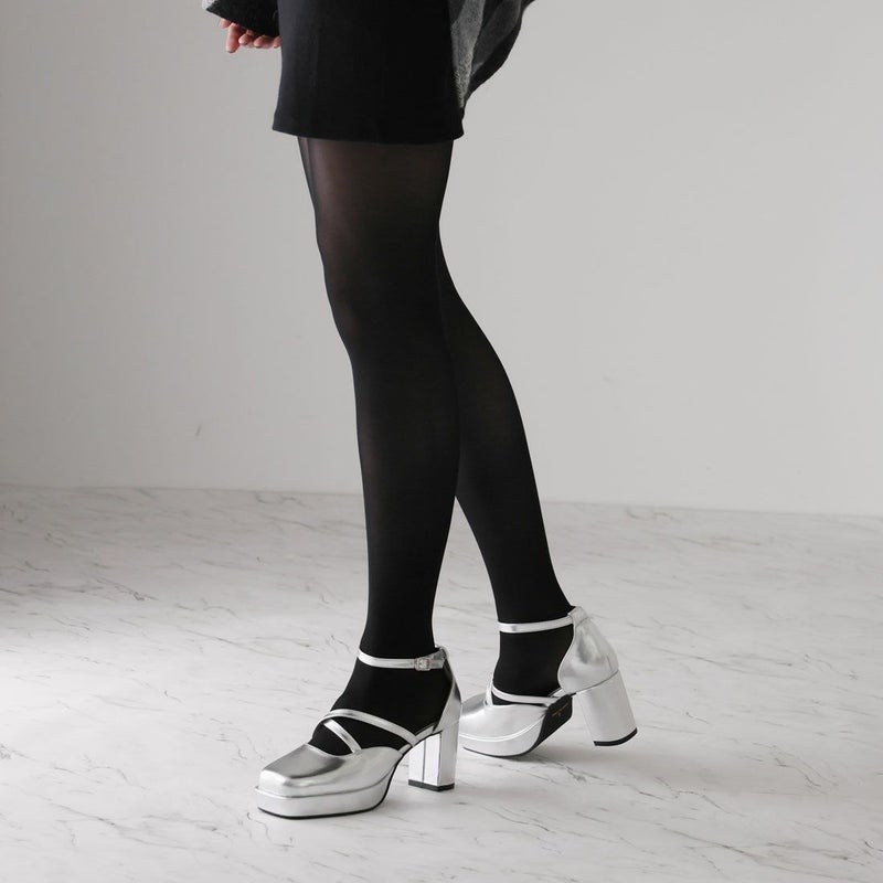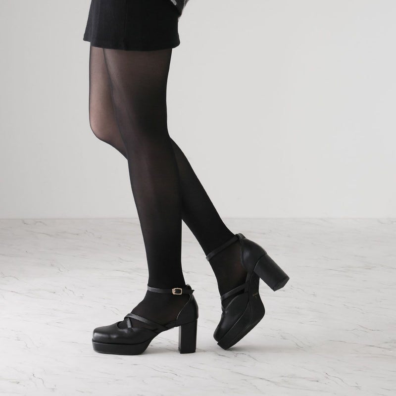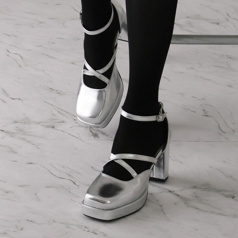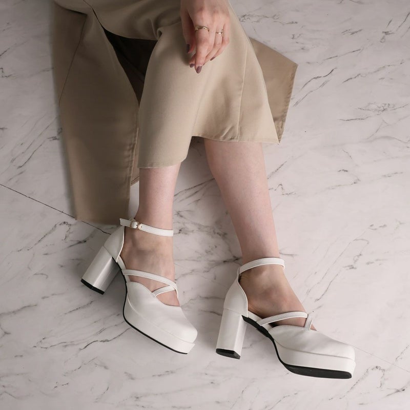・クロスストラップとコロンとしたソフトスクエアトゥでレディライクな足元を演出