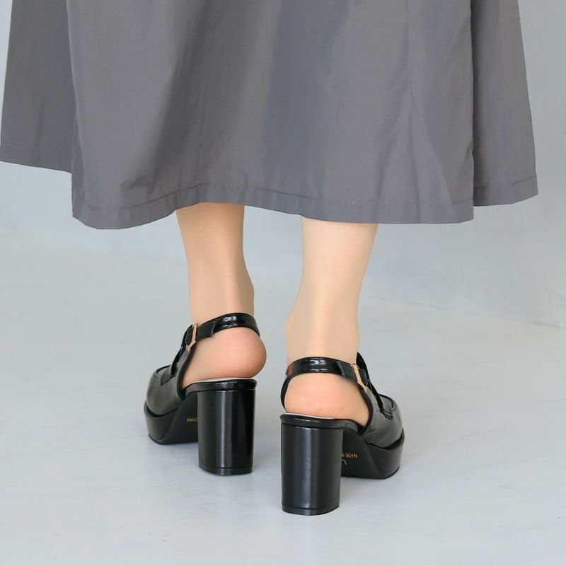 ・スリングバックデザインとコロンとしたソフトスクエアトゥでレディライクな足元を演出