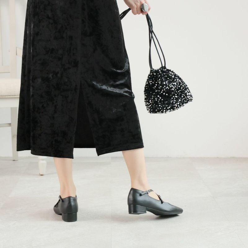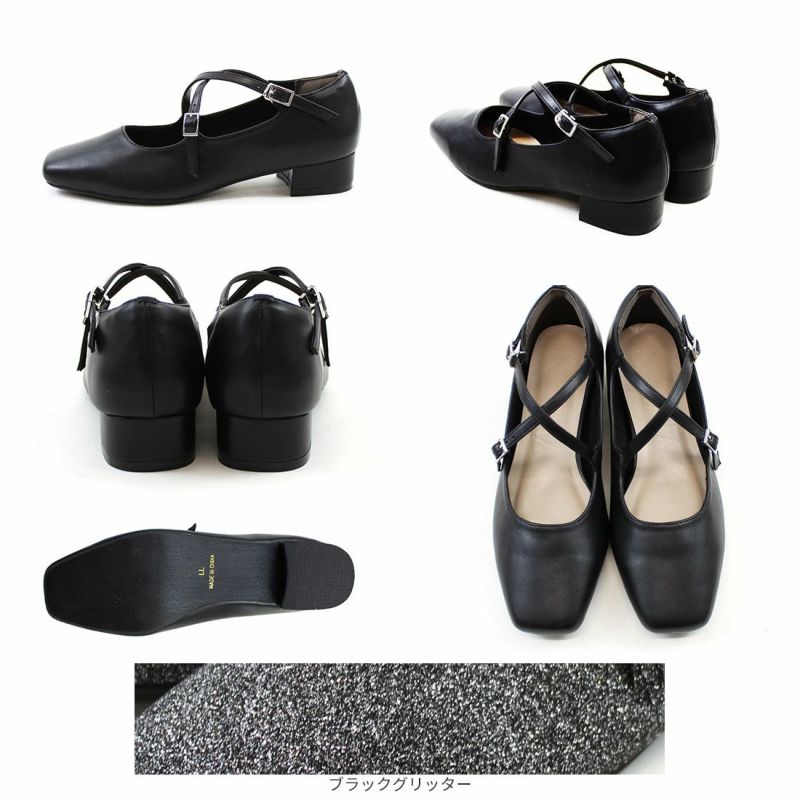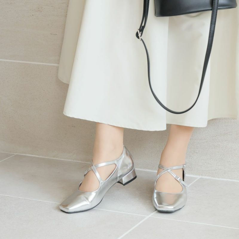 ・クロスストラップとコロンとしたソフトスクエアトゥでレディライクな足元を演出