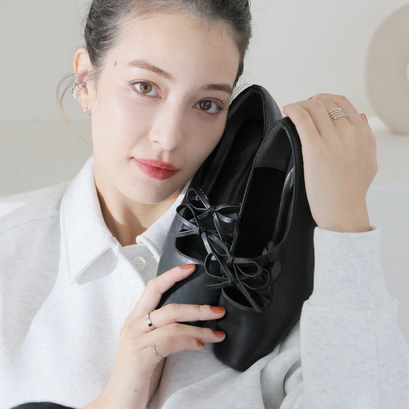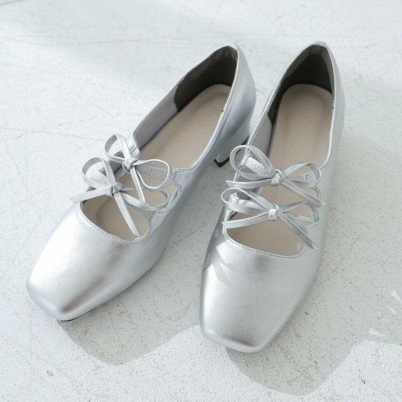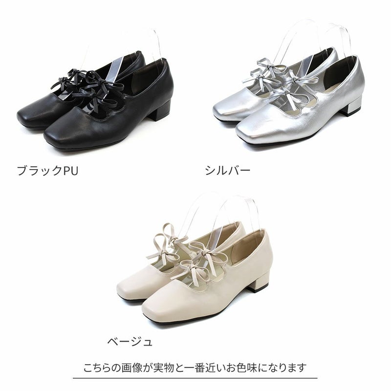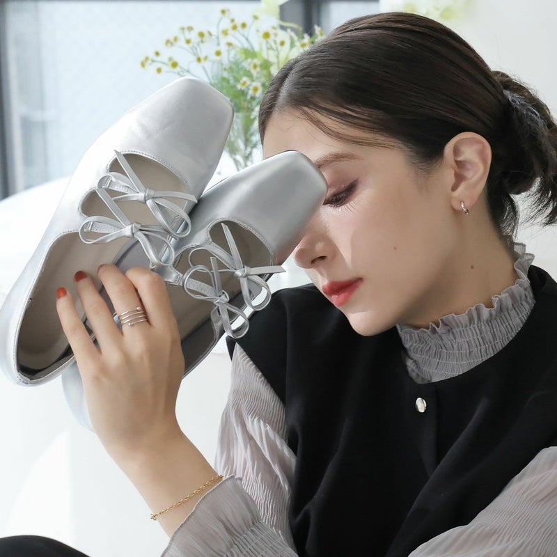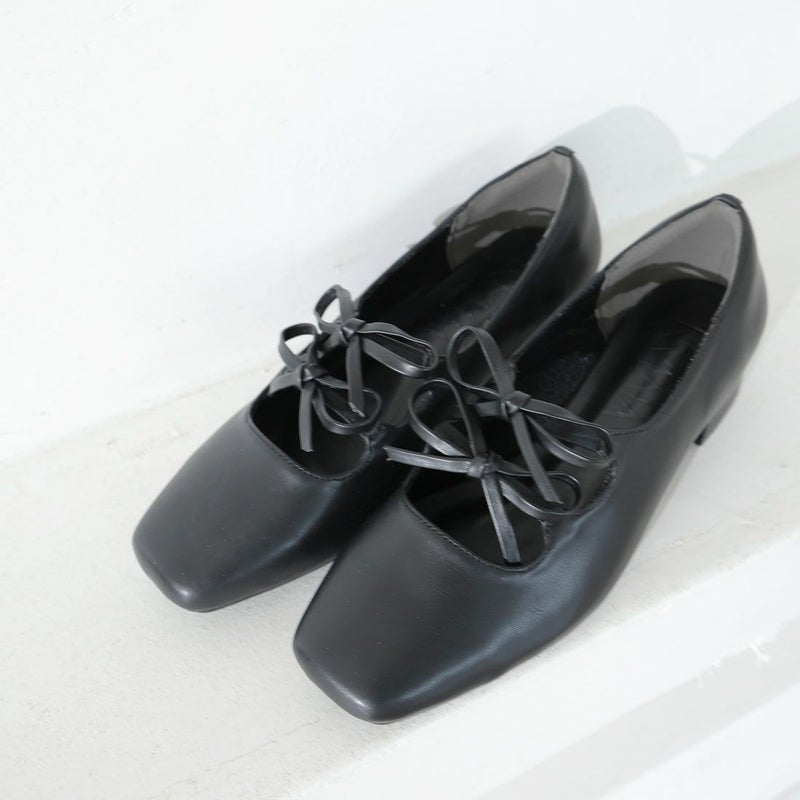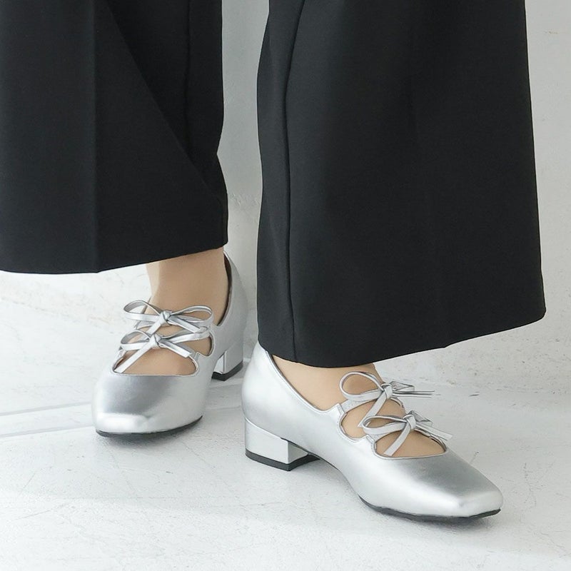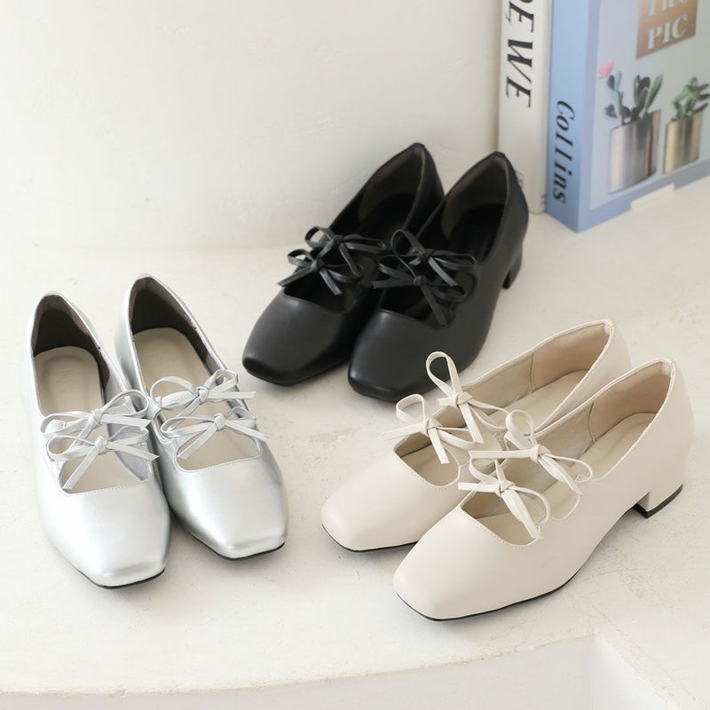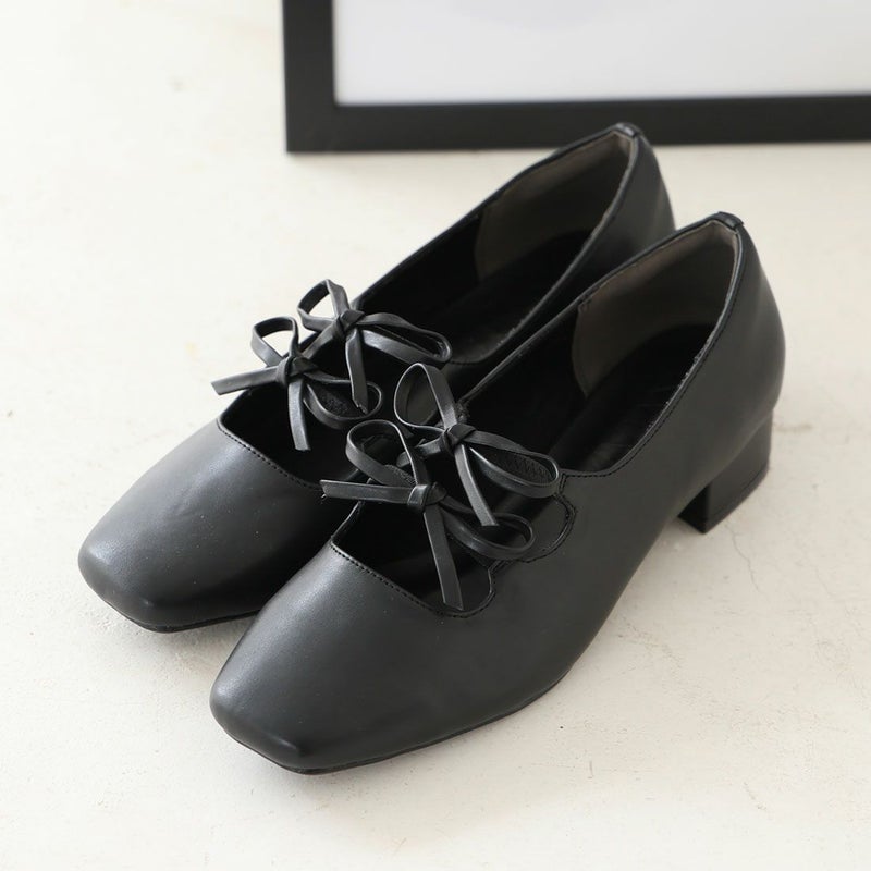 ・ダブルリボンとコロンとしたソフトスクエアトゥでレディライクな足元を演出