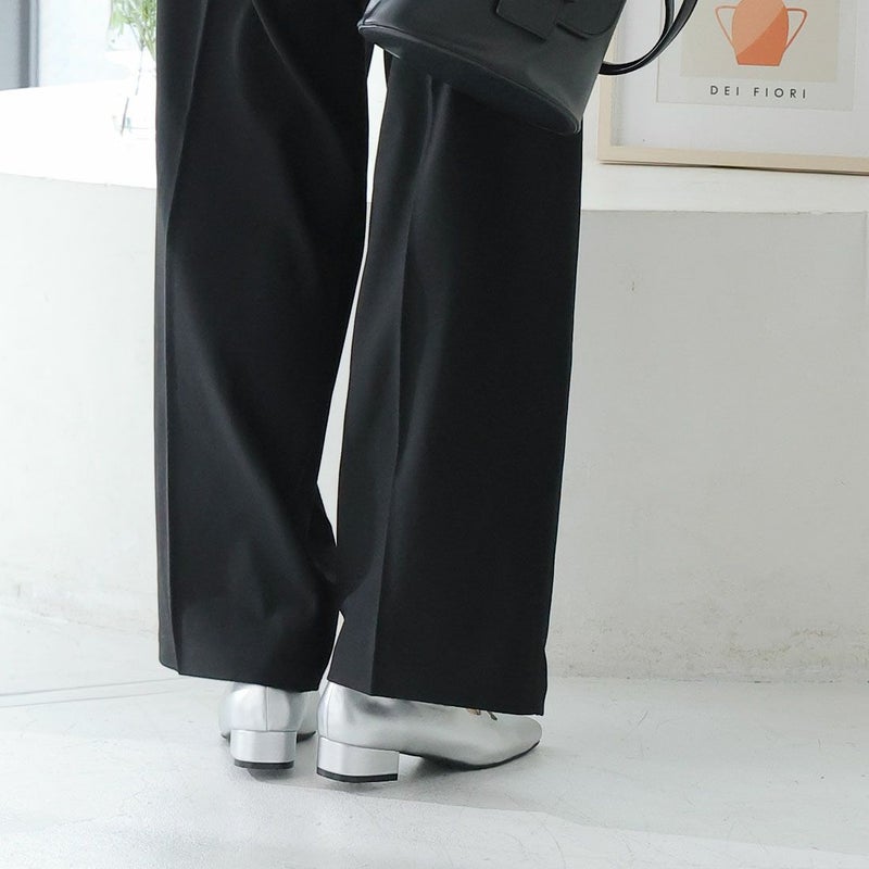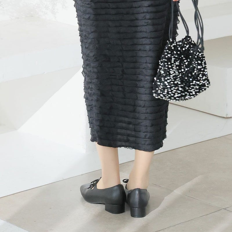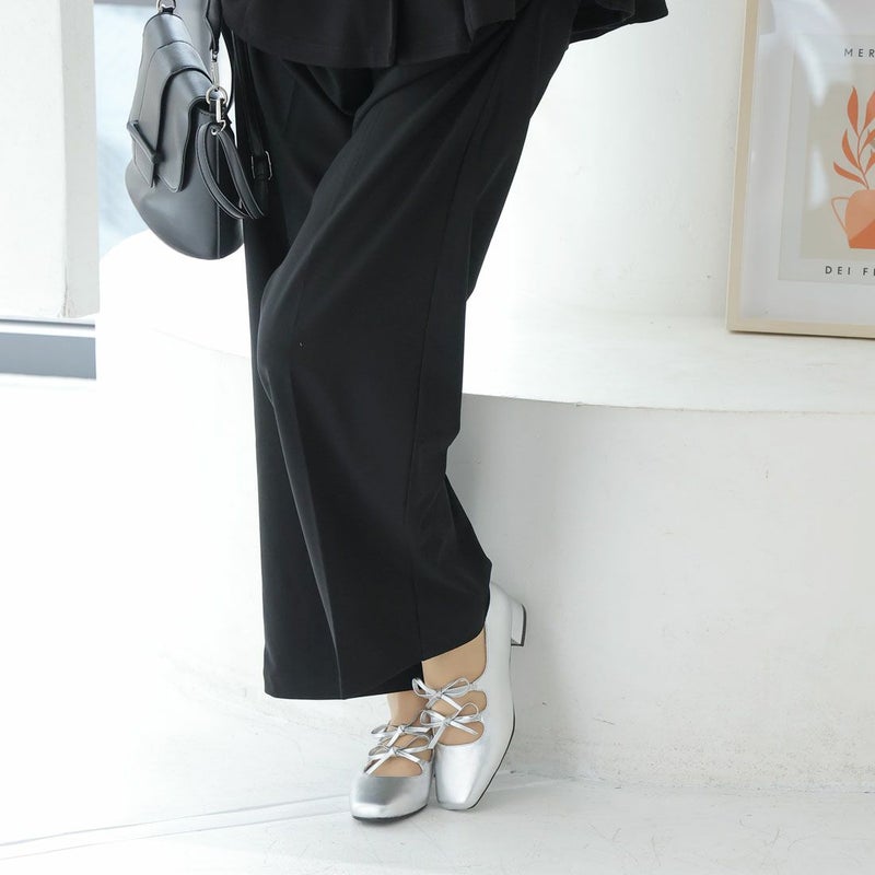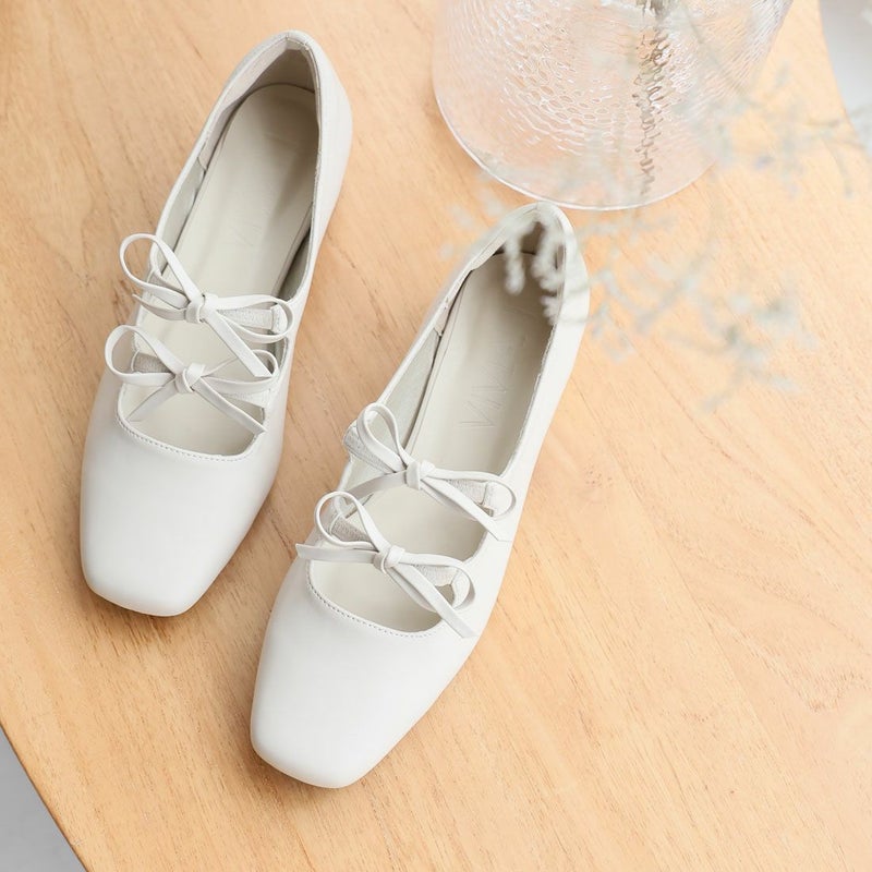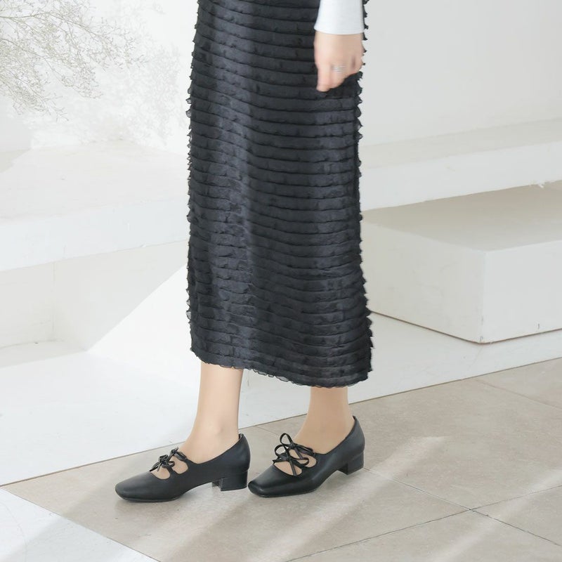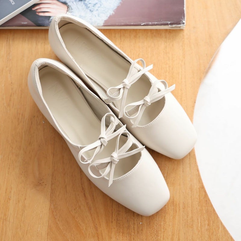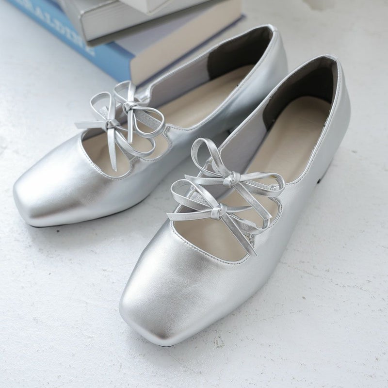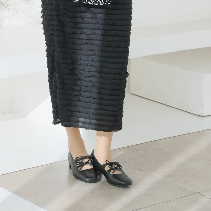 ・ダブルリボンとコロンとしたソフトスクエアトゥでレディライクな足元を演出