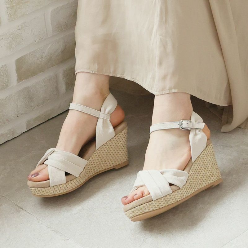 ・柔らかい布地のアッパーと、ラフィア素材のウェッジソールでナチュラルな印象に。