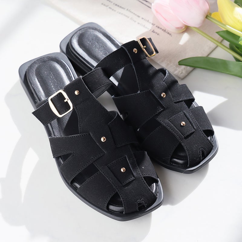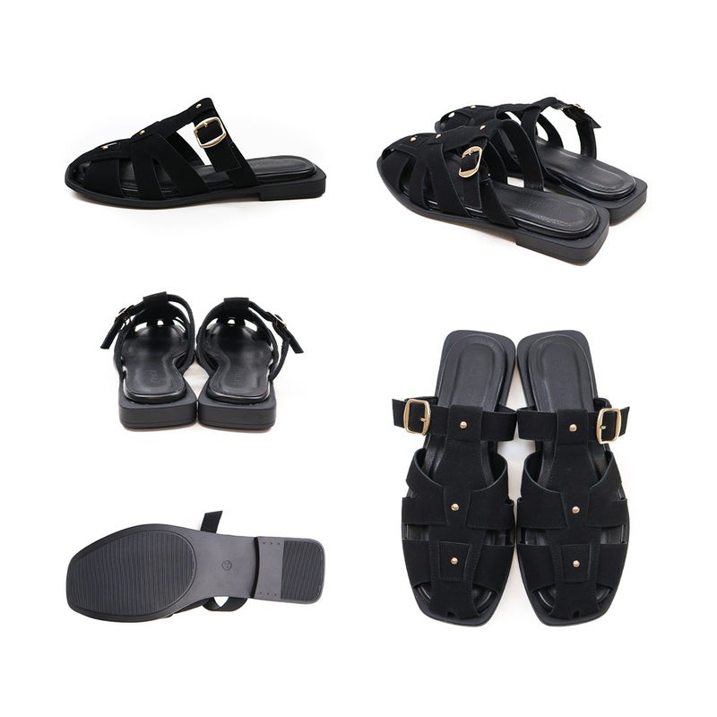 ・甲部分のゴールドのスタッズ使いとバックルがアクセント