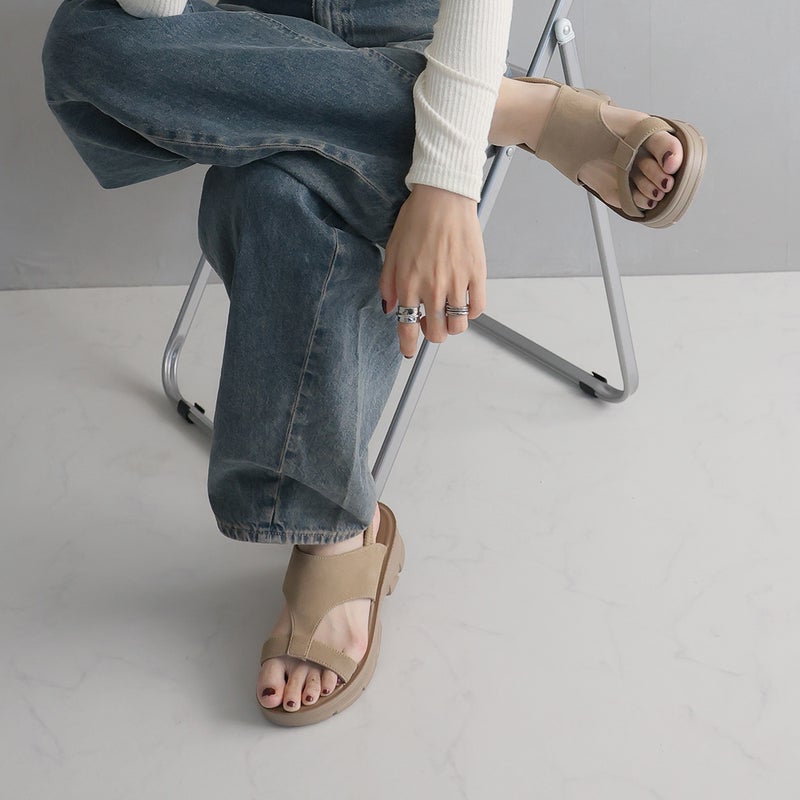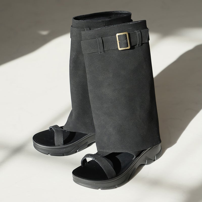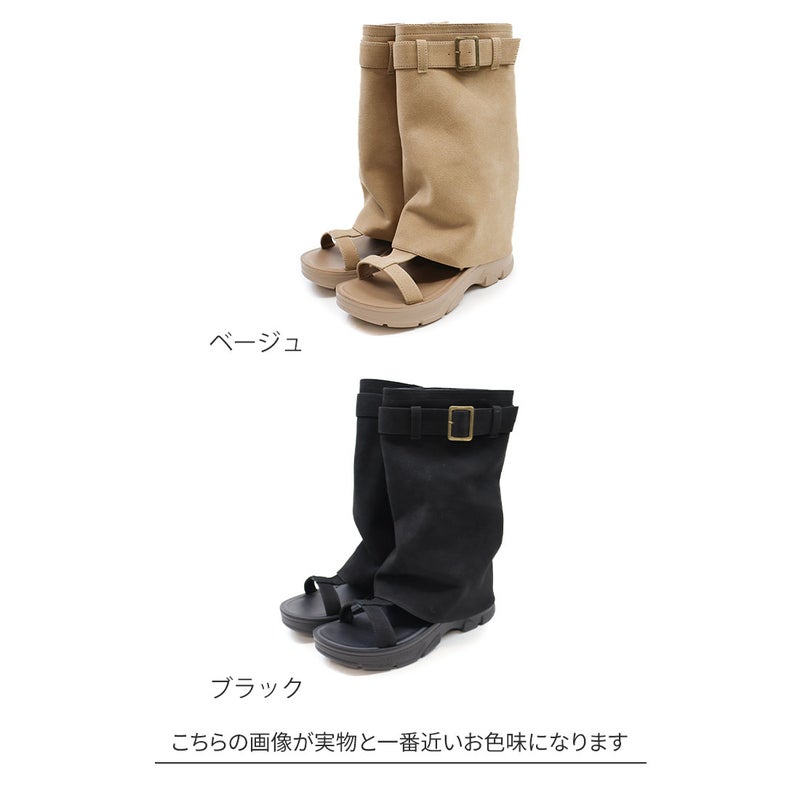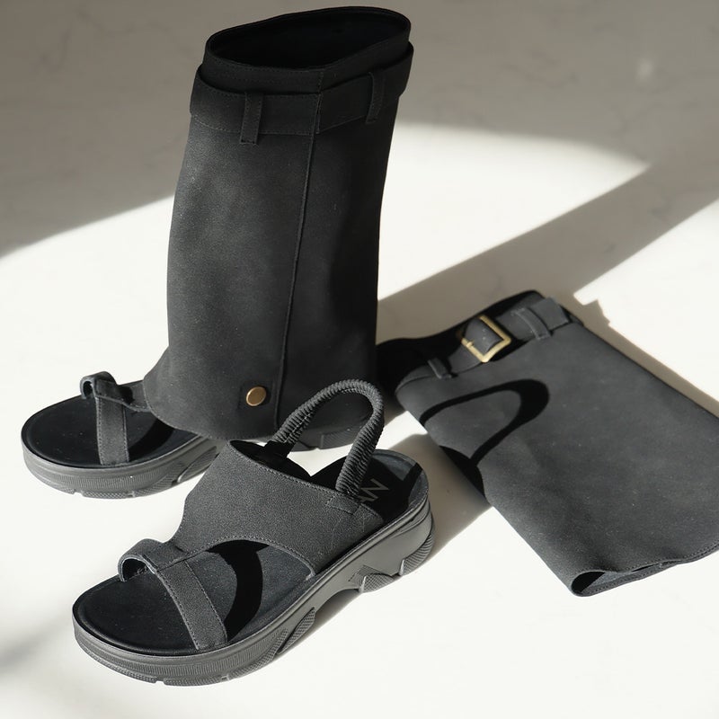 ・バックルベルトデザインの取り外し可能なブーツカバーで、通常のサンダルとしても使える1足2役の遊べるカバーブーツサンダル。コーデに合わせて雰囲気チェンジもできる。