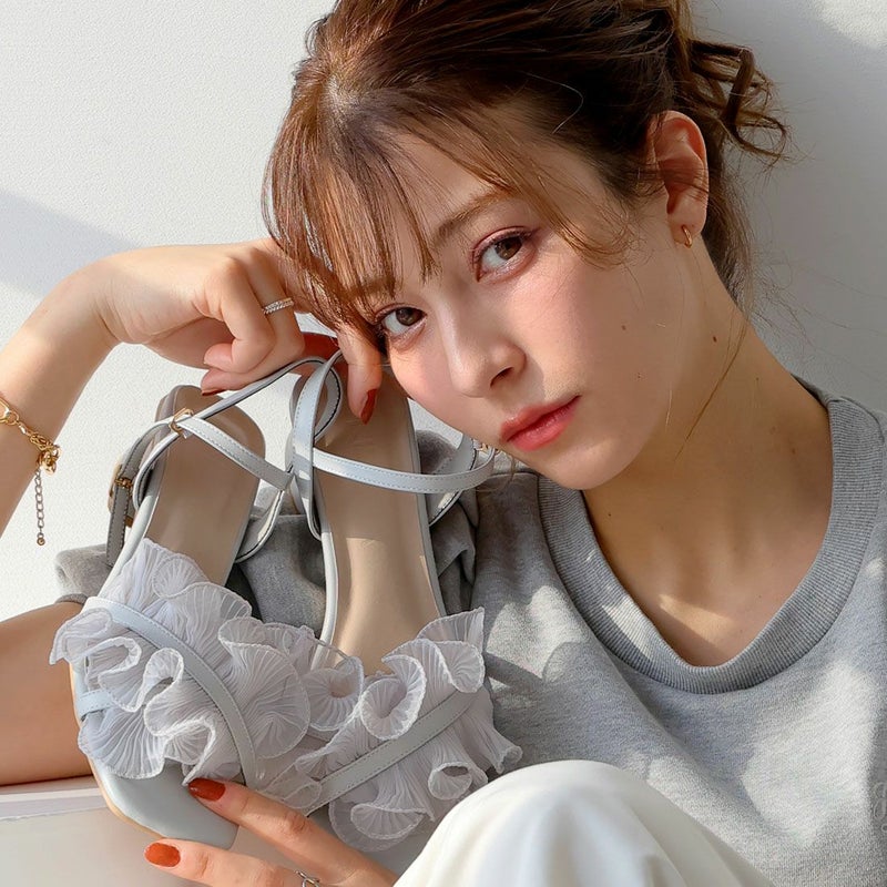 ・定番のアンクルストラップデザインもフリルチュールで大人の抜け感漂う足元に!