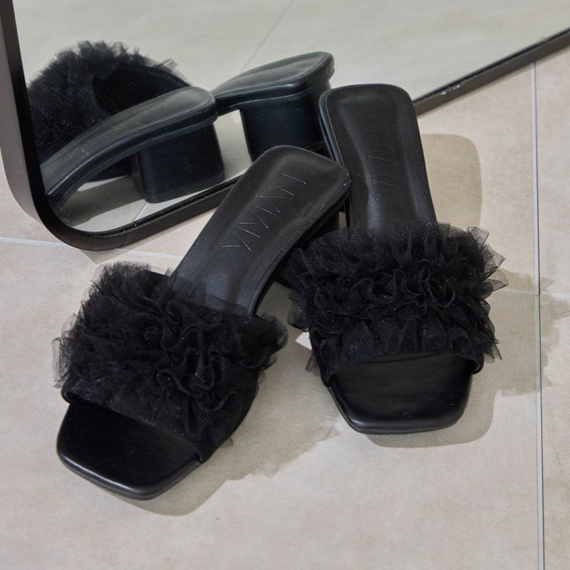 ・定番のミュールデザインも華やかなフリルチュールで大人の抜け感漂う足元に!