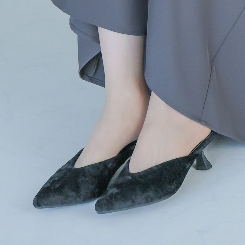 ・ポインテッドトゥ×艶のあるくびれ斜めヒールで甘くなりすぎない上品フォルム