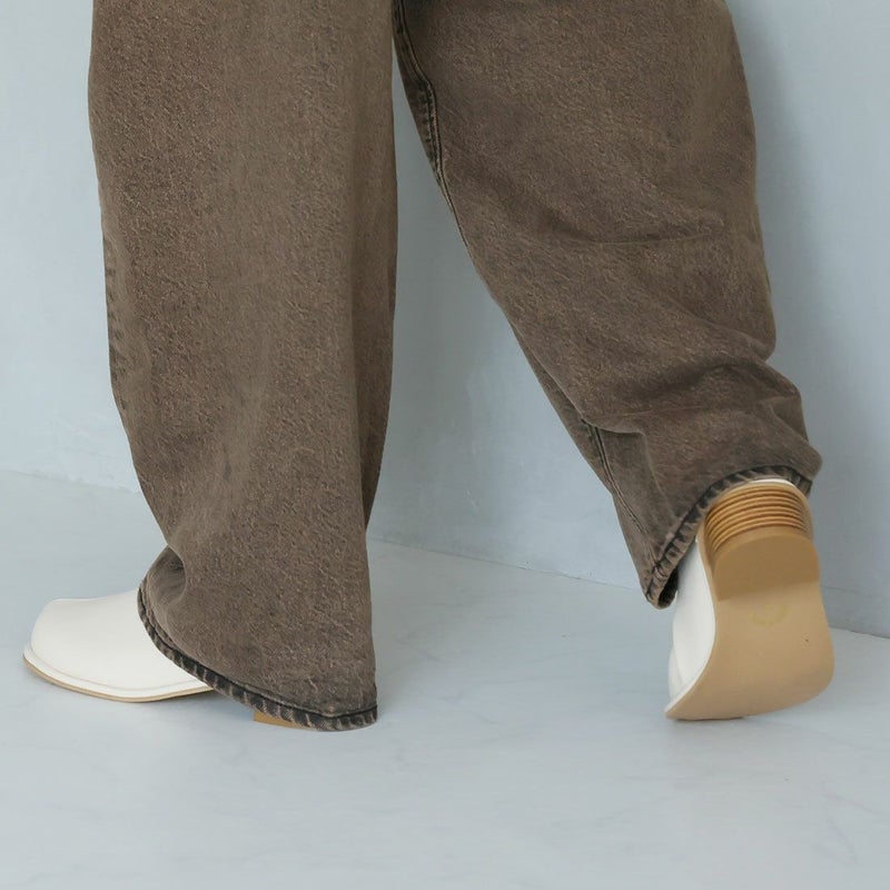 ・ぽってりとしたトゥ×スタックプリントヒールでシンプルなコーデに抜け感をプラス。