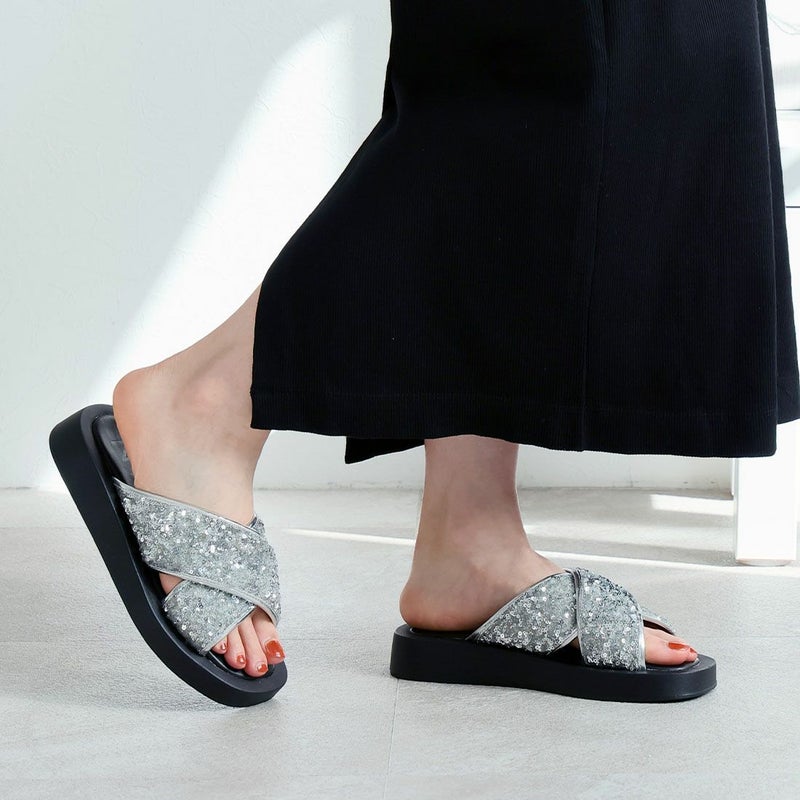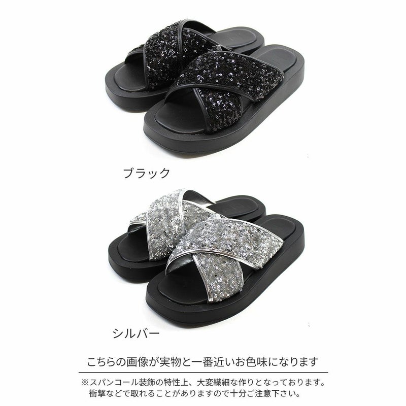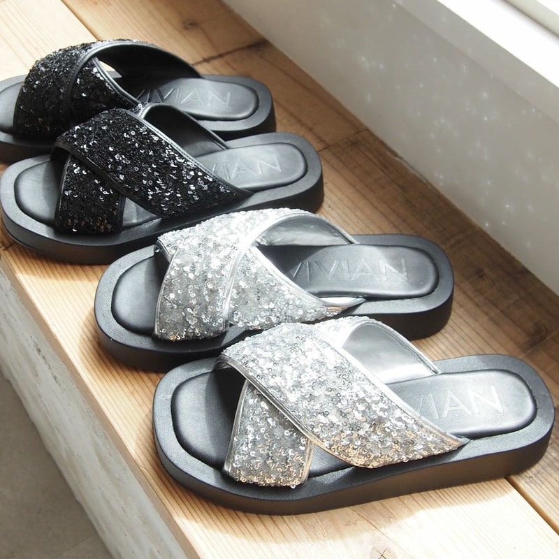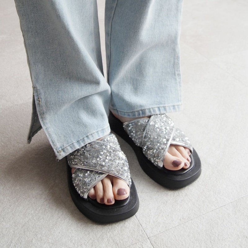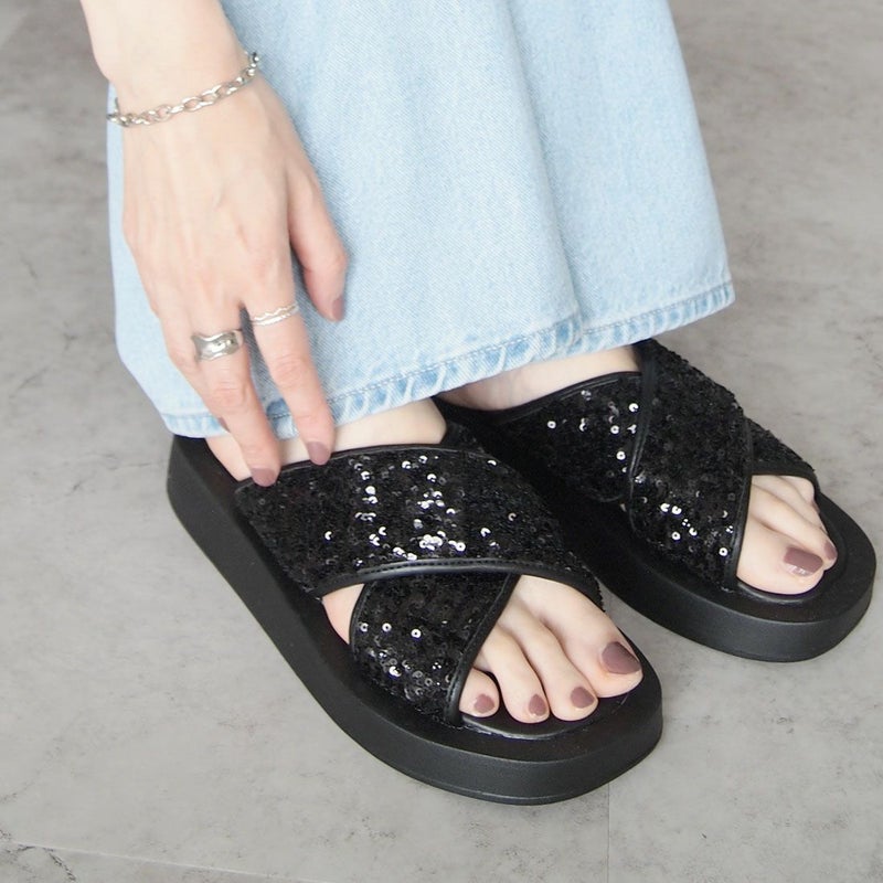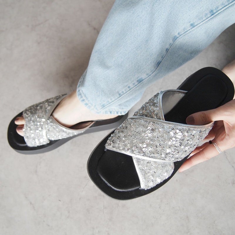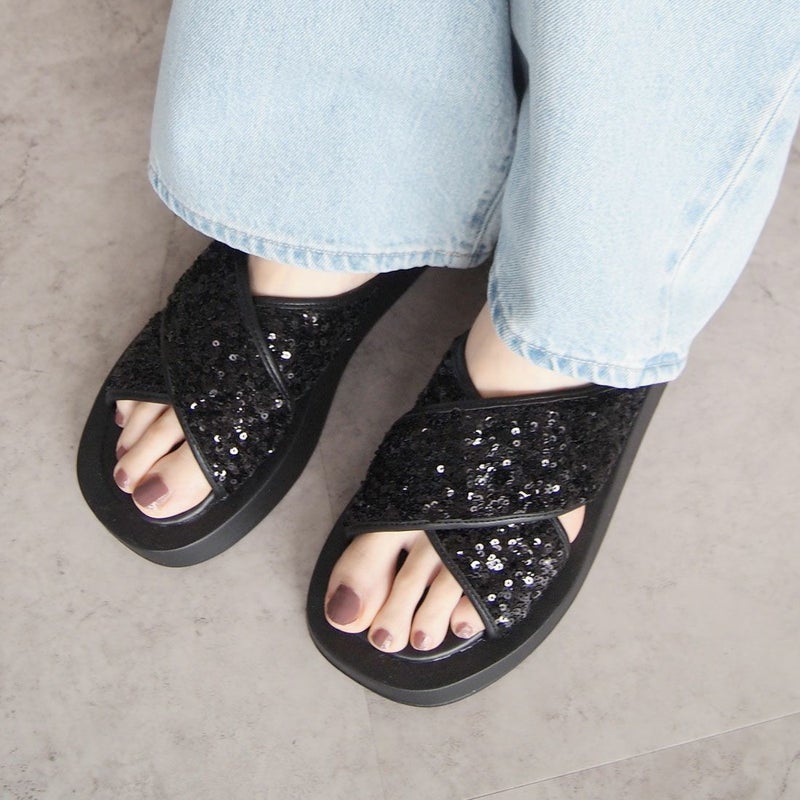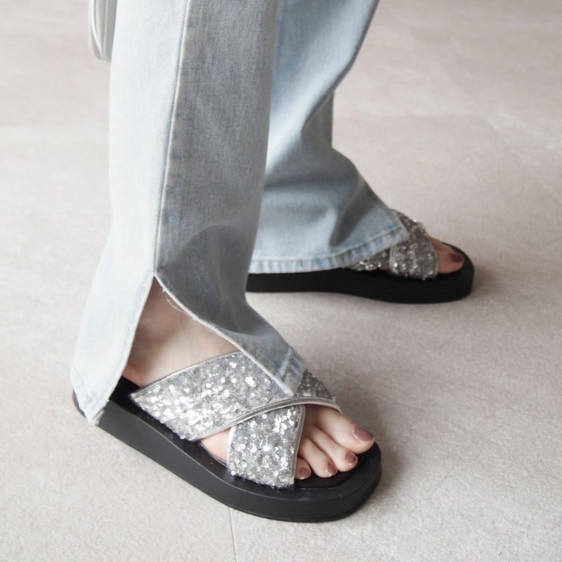 ・スパンコールの輝きをプラスした主役級キラキラクロスバンドサンダル