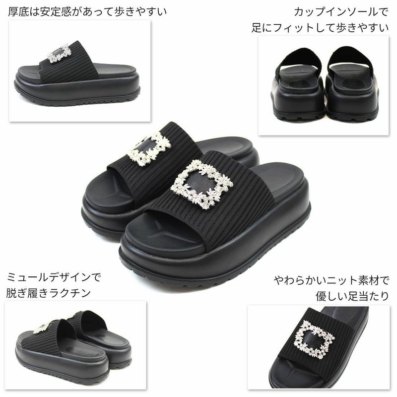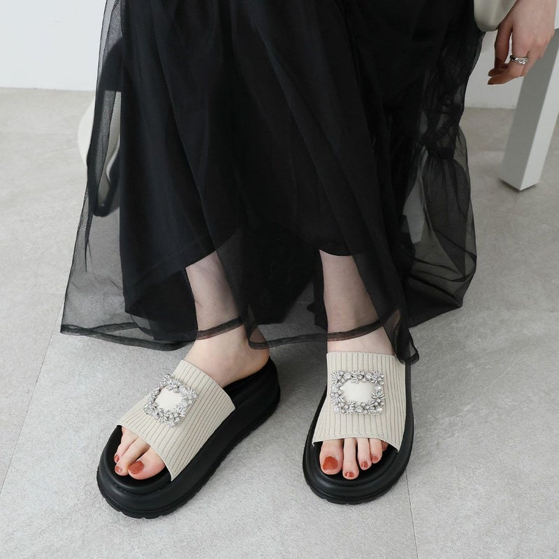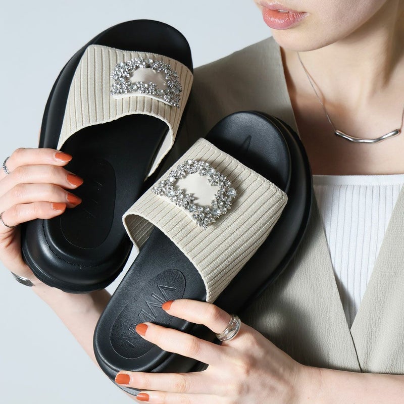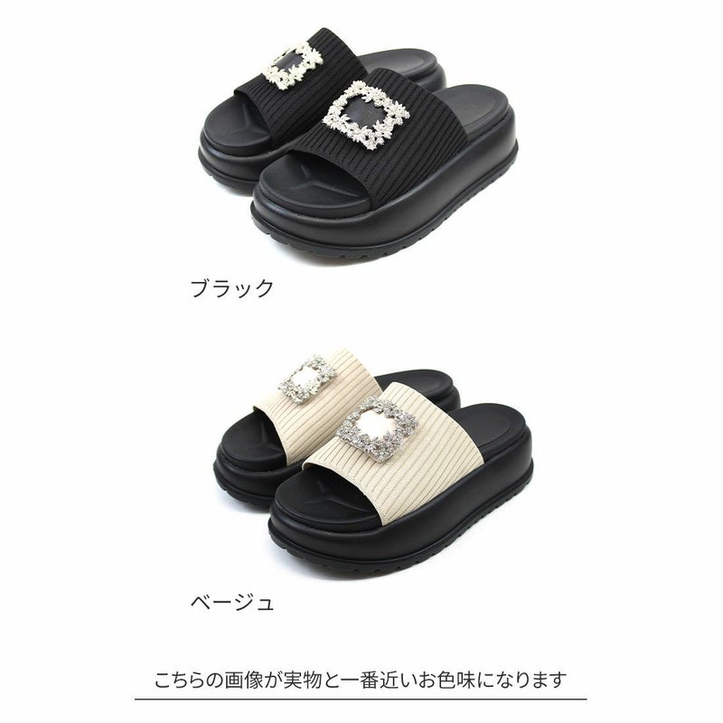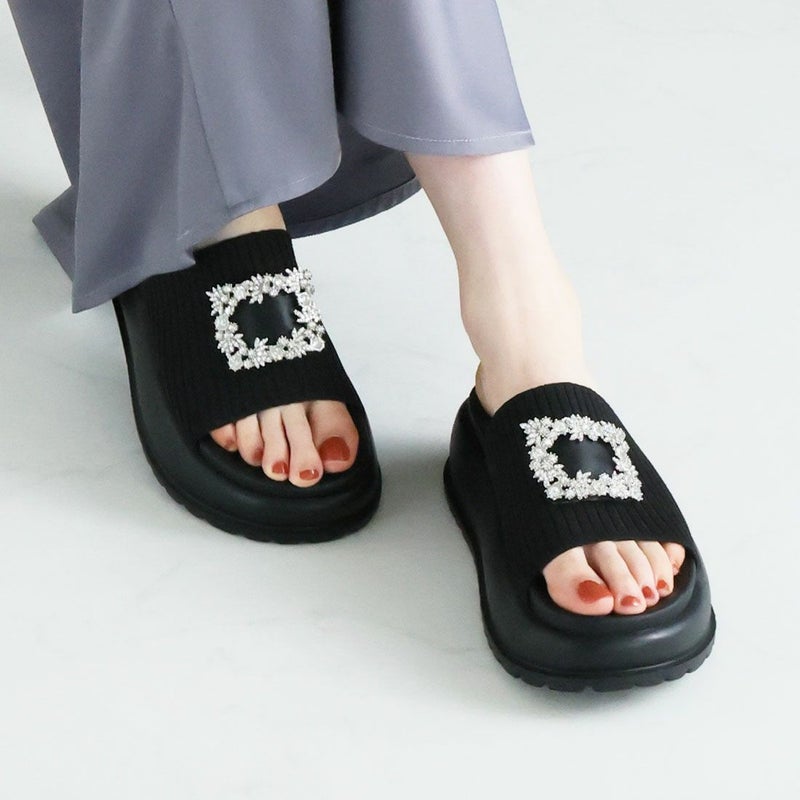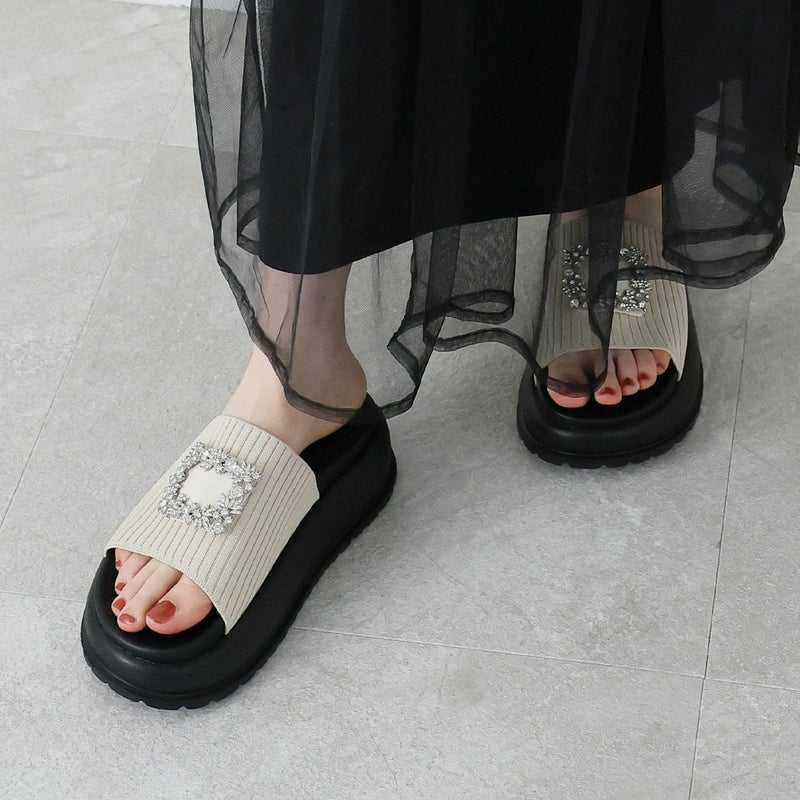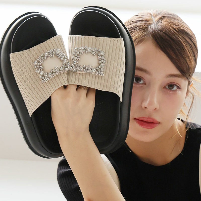 ・キラキラビジューバックルが輝くリブニットサンダル!