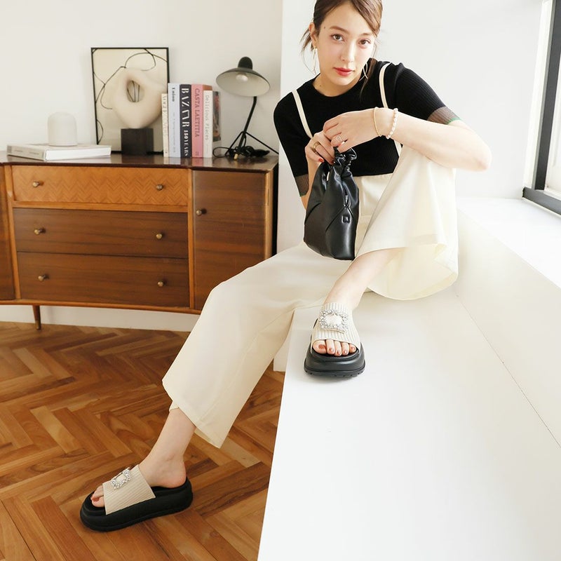 ・高級感のあるビジューバックルは、いつものコーデに合わせるだけでエレガントさをプラス。
