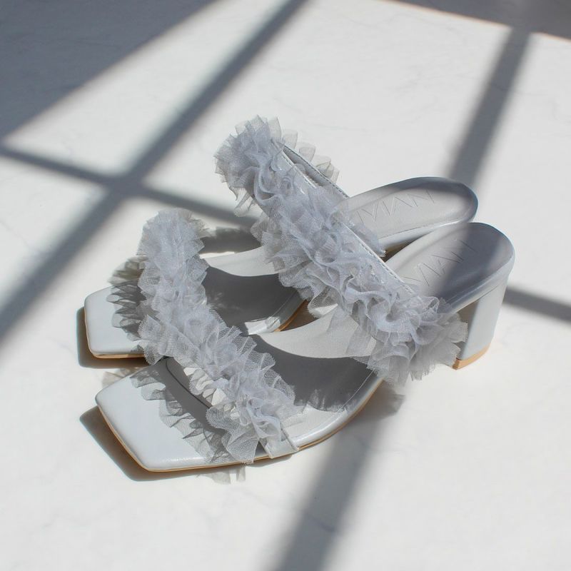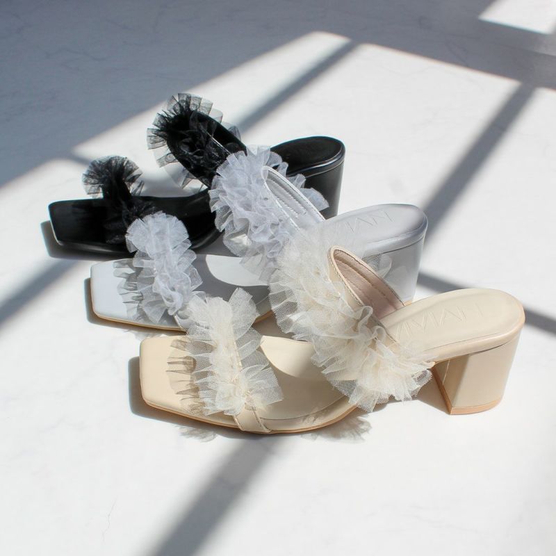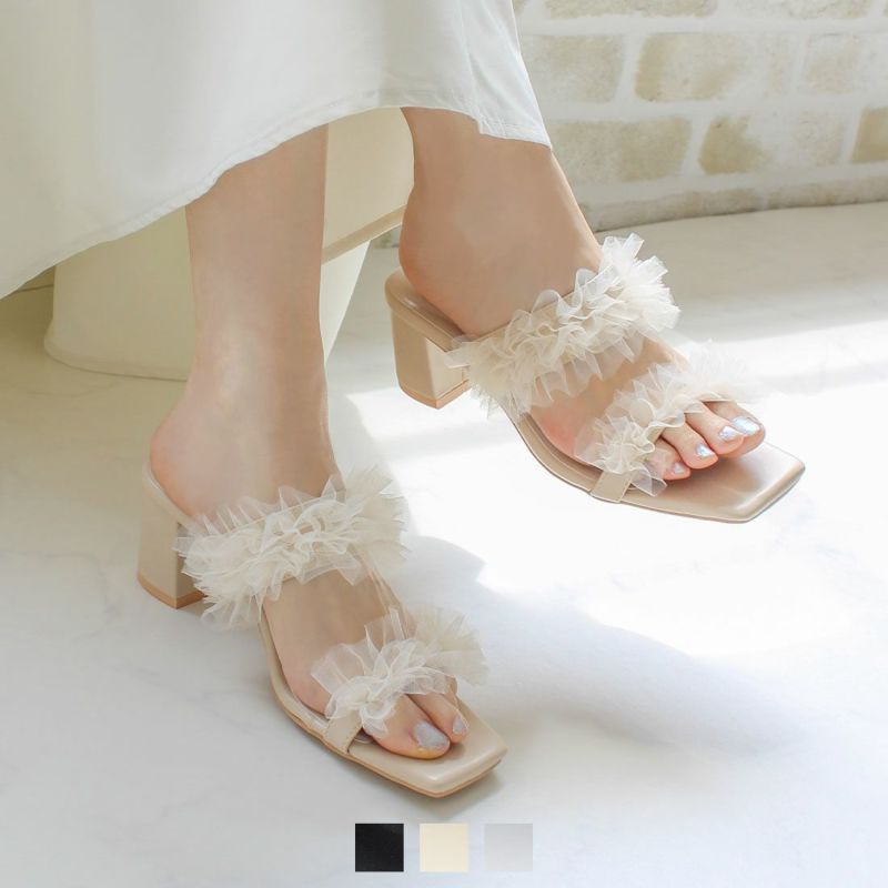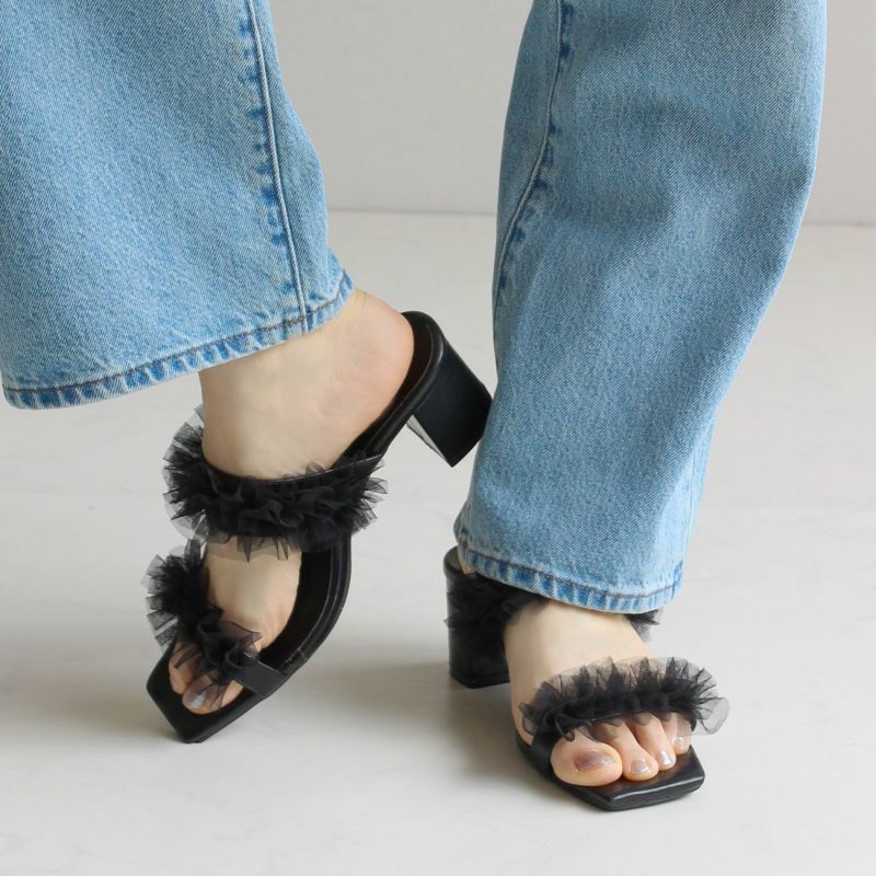 ・定番のミュールデザインも華やかなフリルチュールで大人の抜け感漂う足元に!