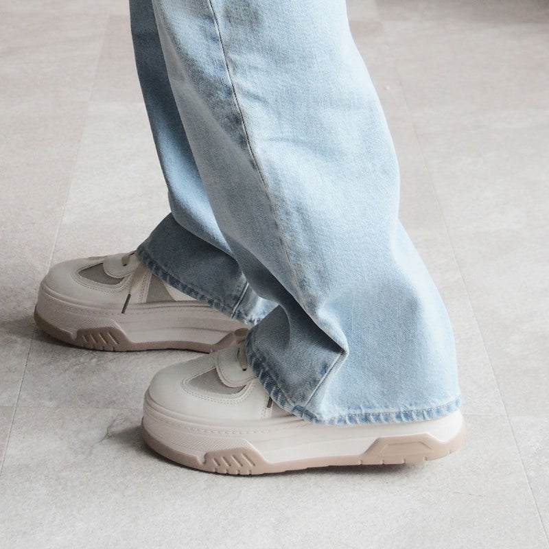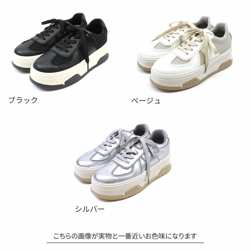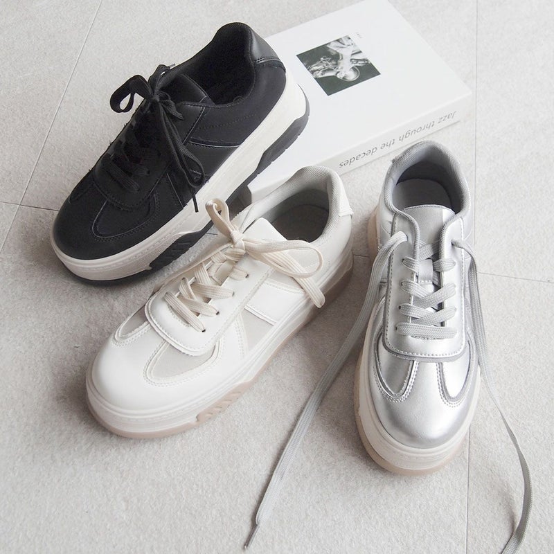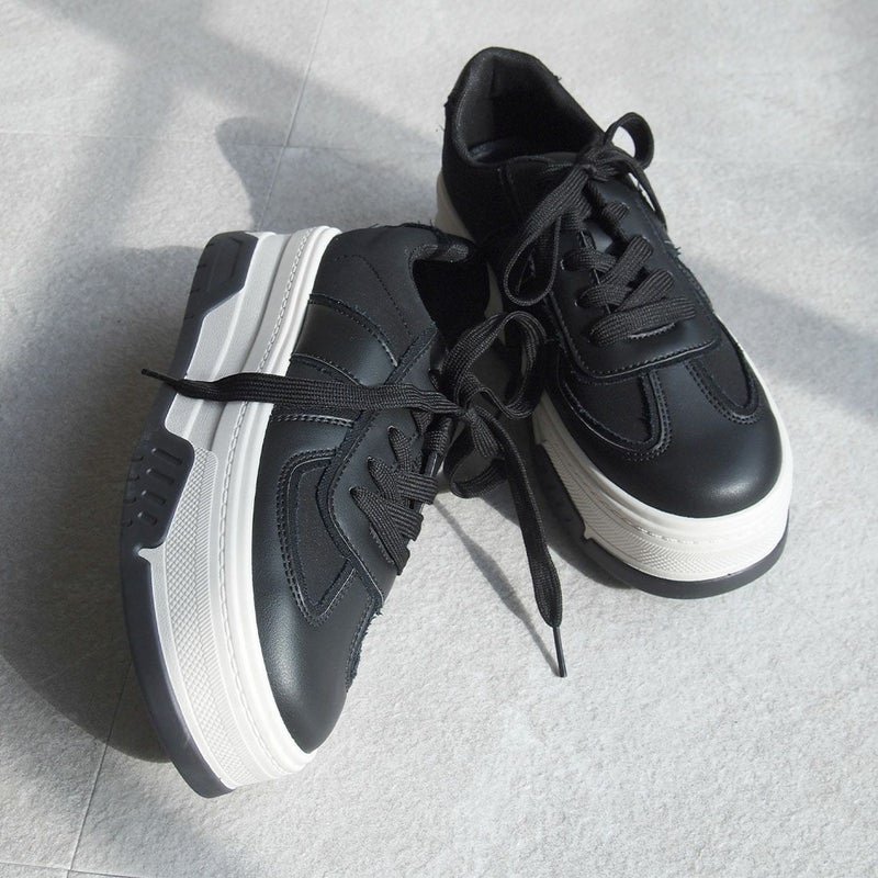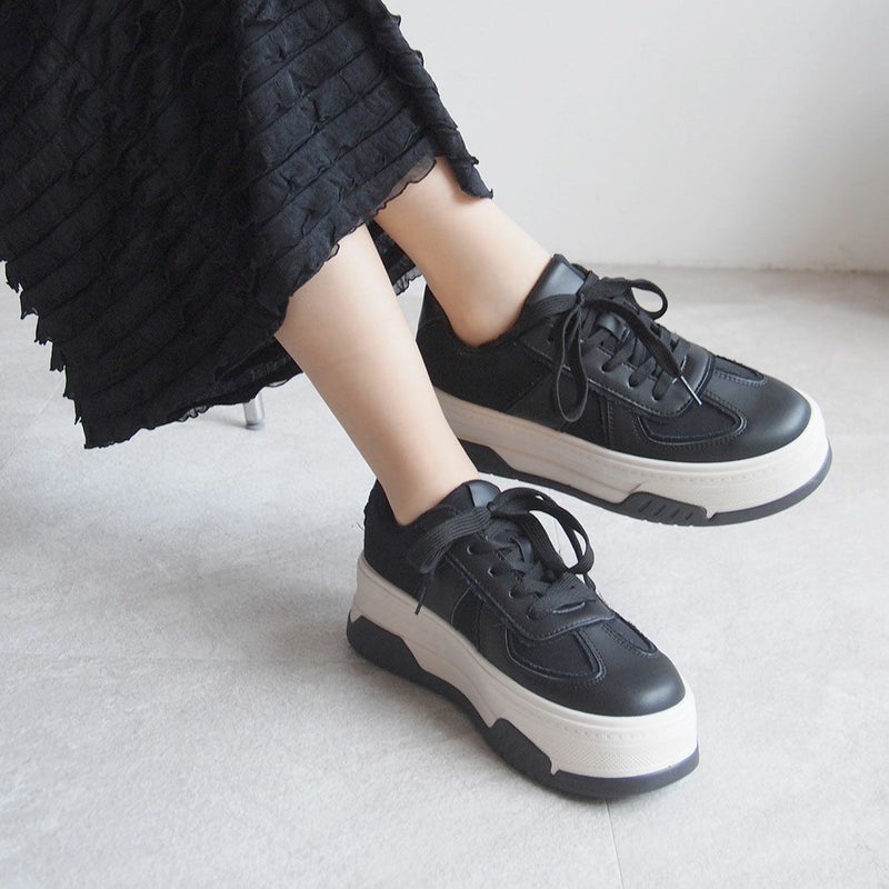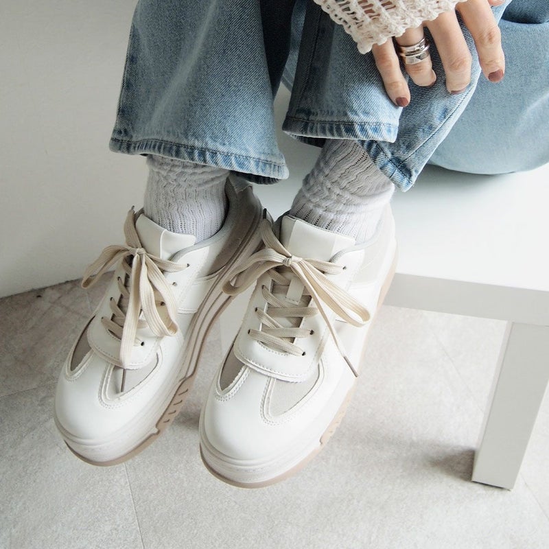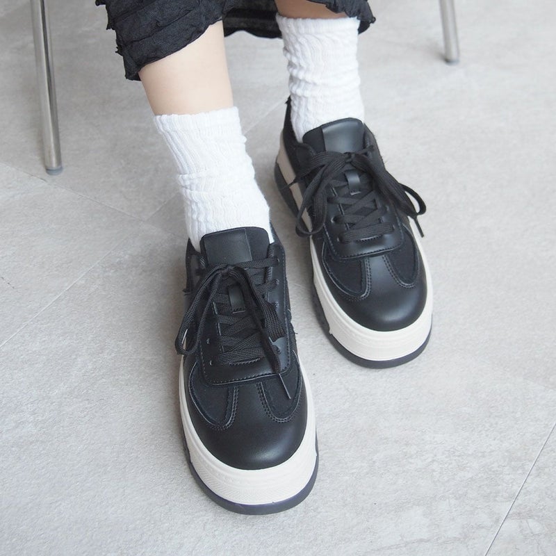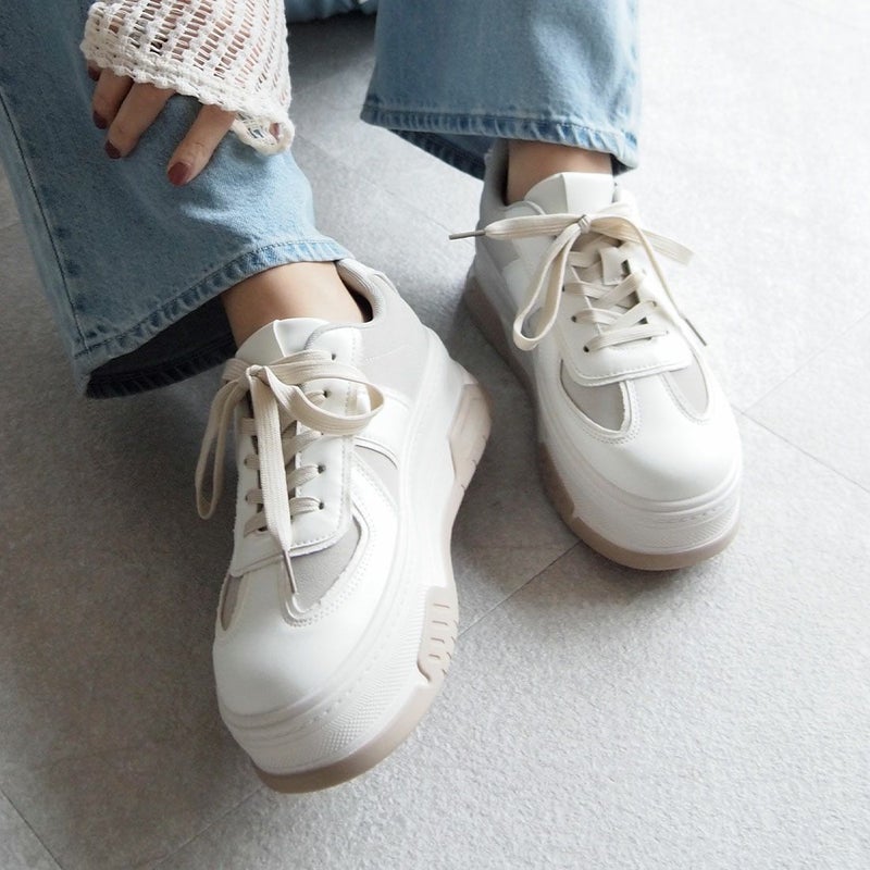 ・異素材コンビカラーの厚底Tトゥデザインレースアップスニーカー!