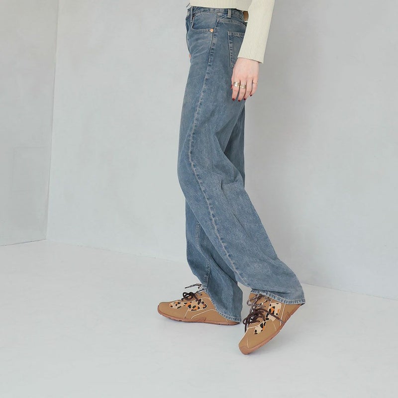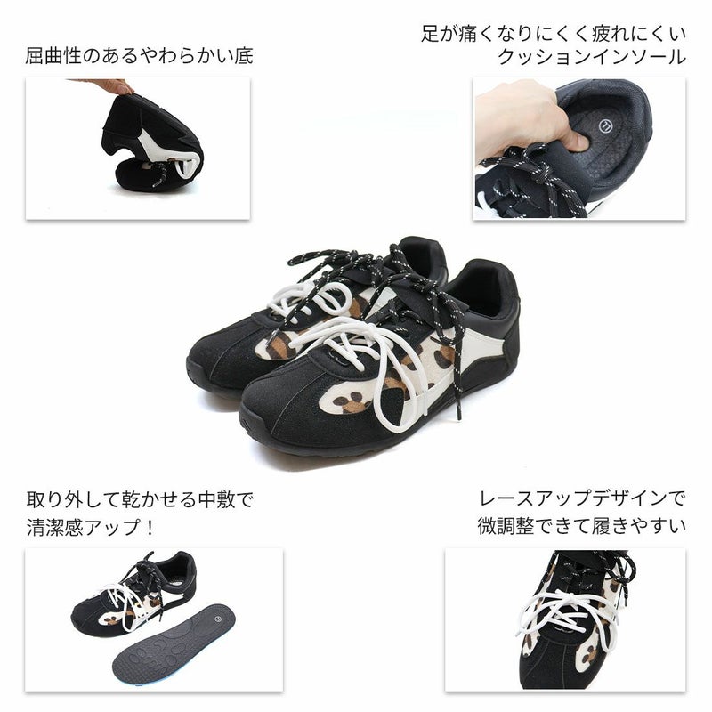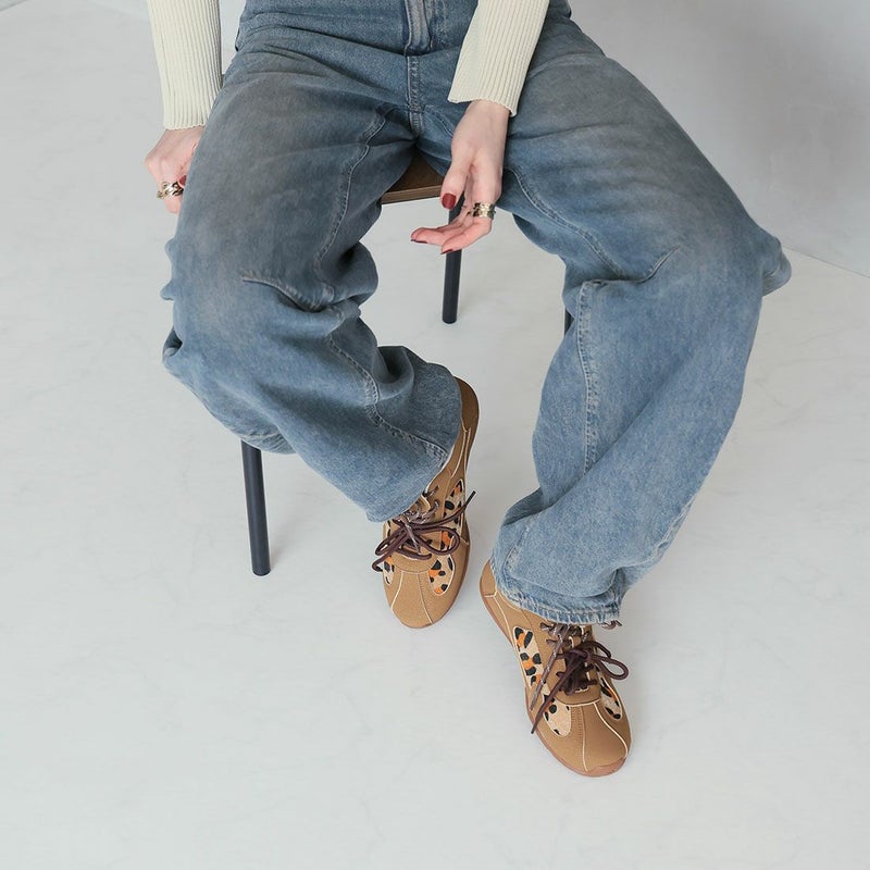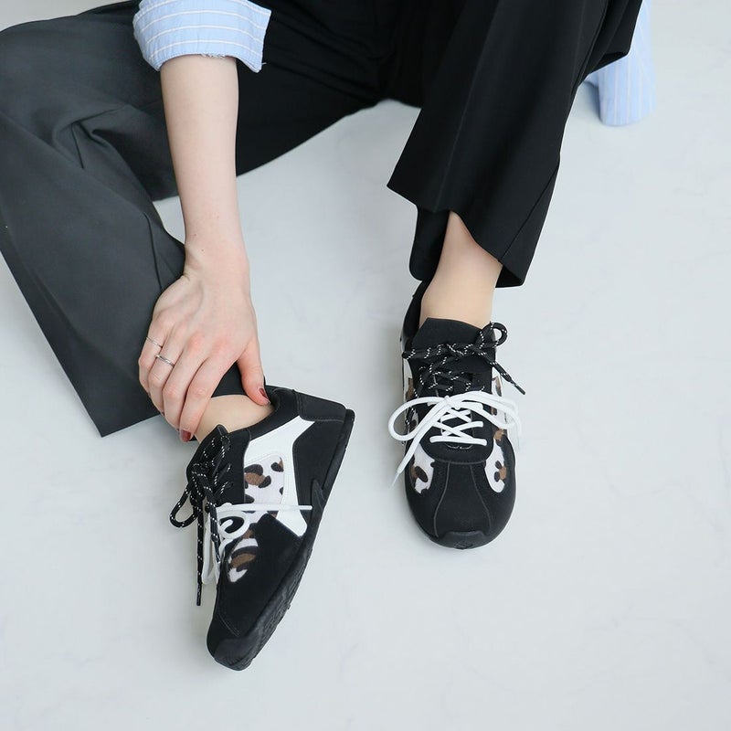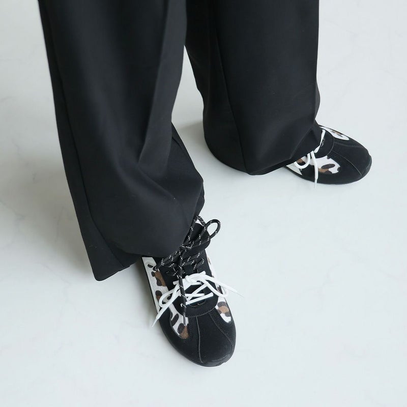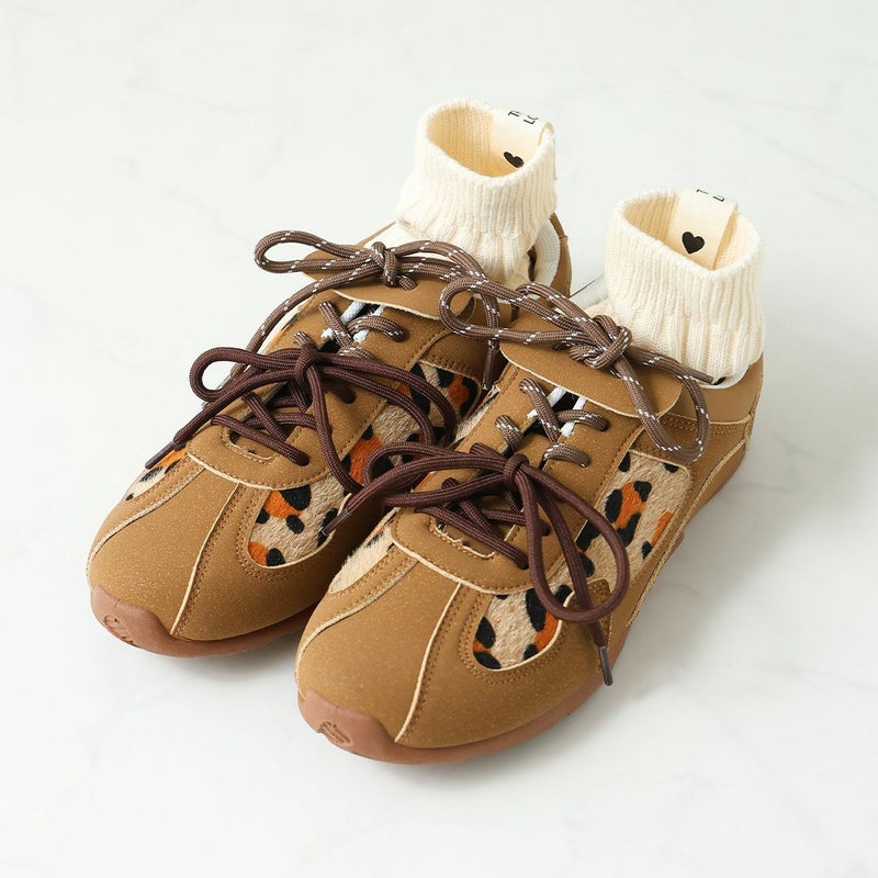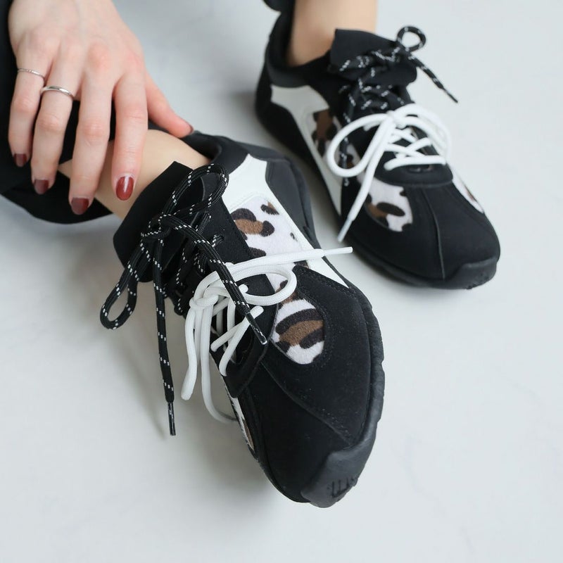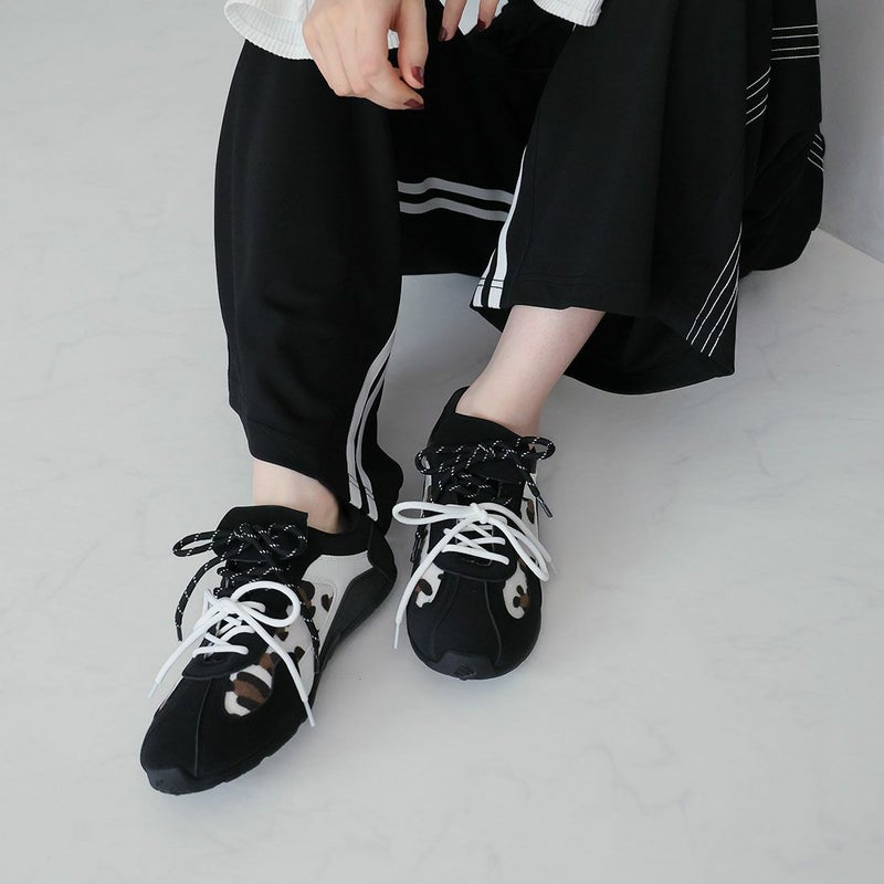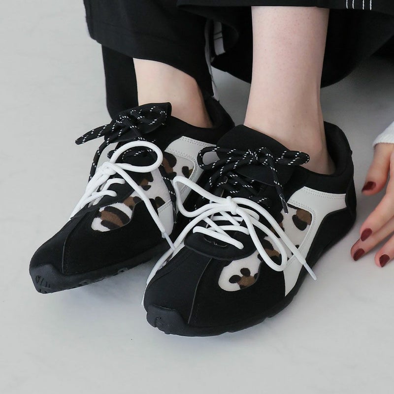 ・ダブルのシューレースリボン×折り返しフラップ×レオパード柄×Tトゥデザインでトレンド詰め込み系スニーカー