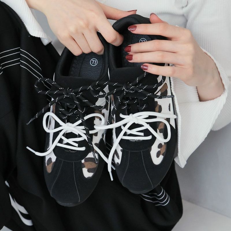 ・ダブルのシューレースリボン×折り返しフラップ×レオパード柄×Tトゥデザインでトレンド詰め込み系スニーカー