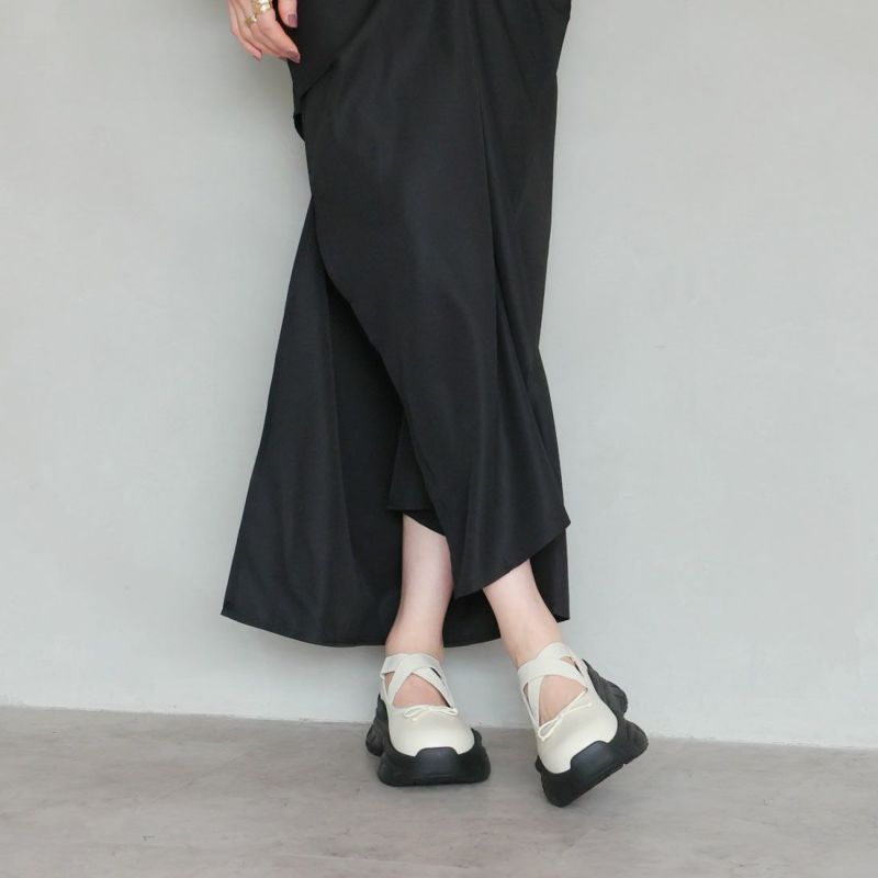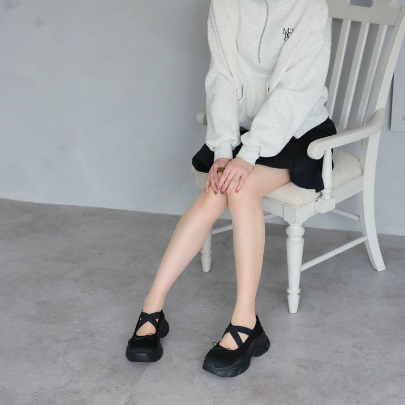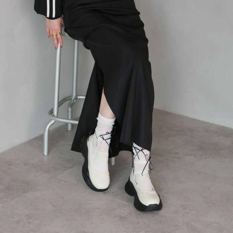 ・ぽってりとしたボリュームソールとクロスゴムがポイントの厚底バレエシューズスニーカー
