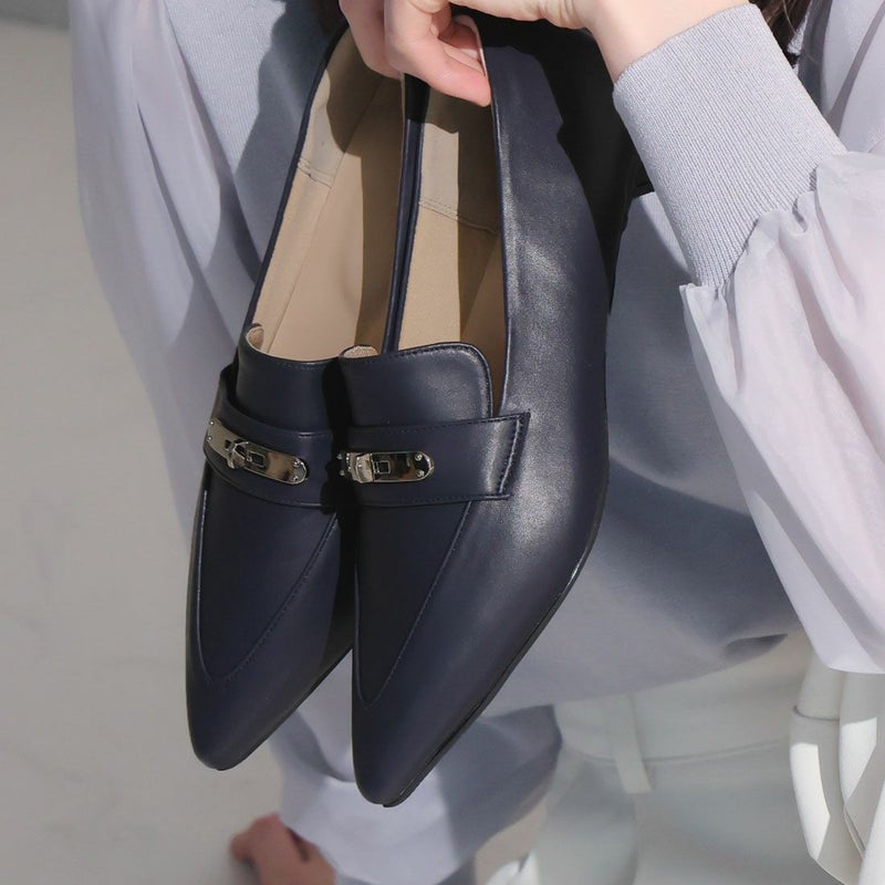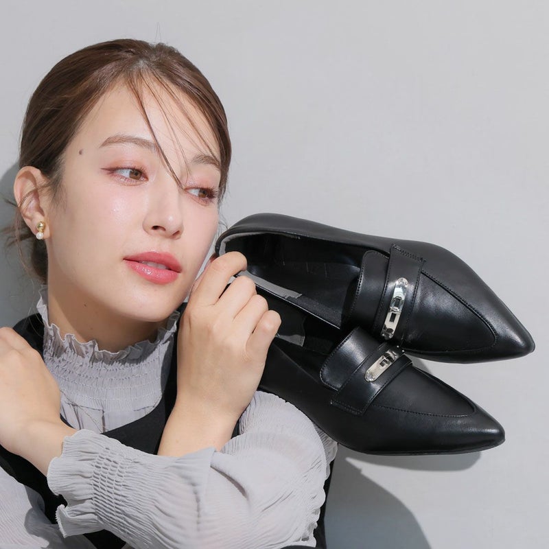 ・すっきりとした美しいシルエットとキラリと光るシルバーのメタルパーツが映えるローファーパンプス!