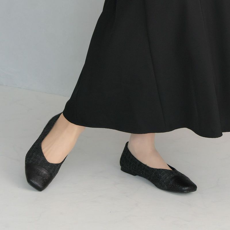 ・キラキラのグリッター×上品なラメ糸入りツイードがアクセサリー感覚で履ける!異素材の切り替えデザインがポイントのフラットパンプス!