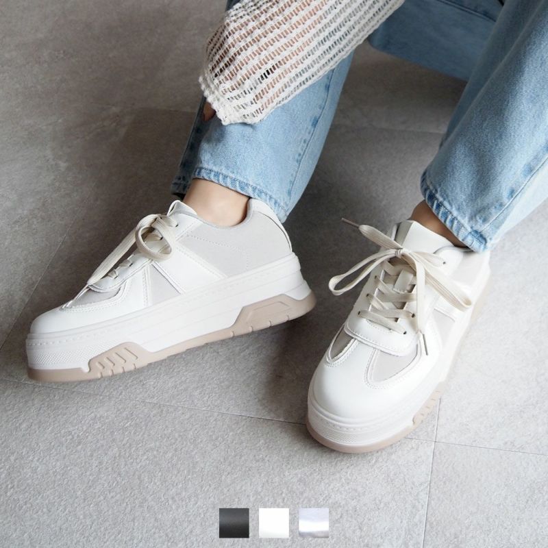 ・異素材コンビカラーの厚底Tトゥデザインレースアップスニーカー!