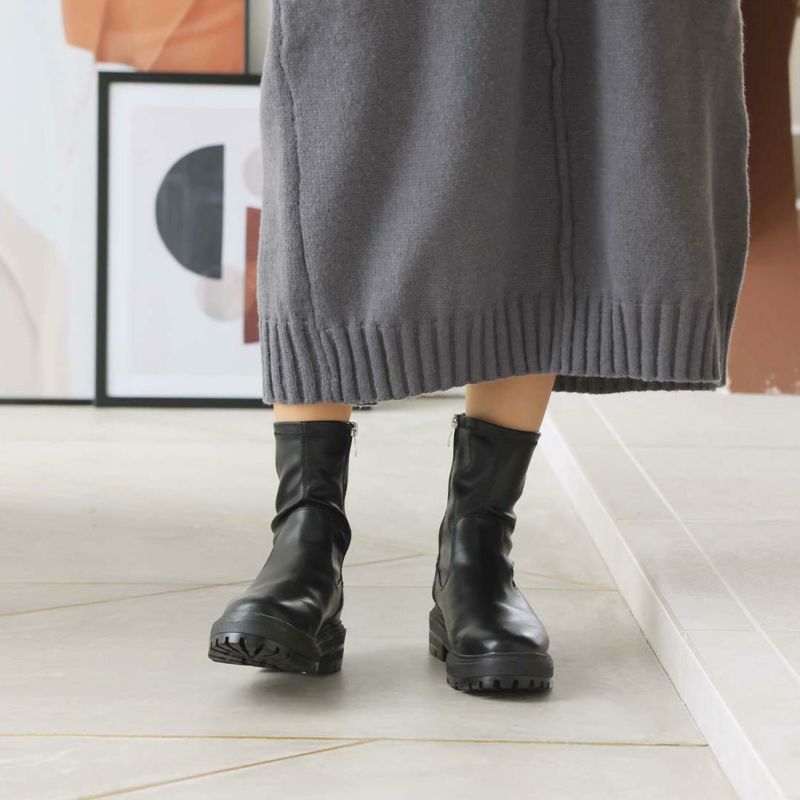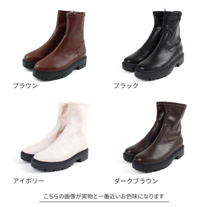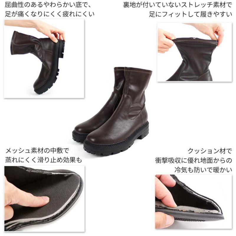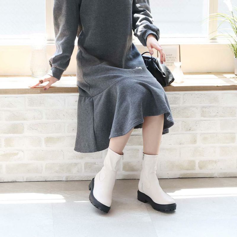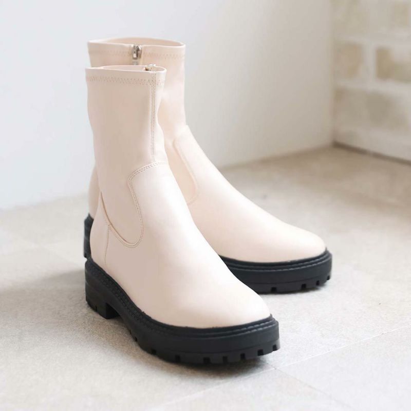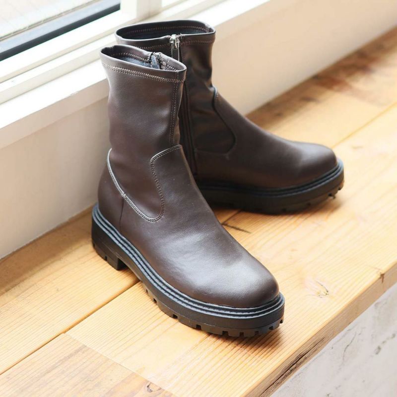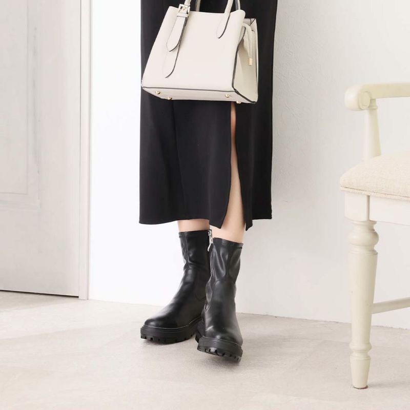 ・ゴツめデザインで足元にボリュームを持たせ、伸縮性のあるストレッチ素材が足にフィットし引き締まって見えるので、スタイルアップが期待できるアイテム。