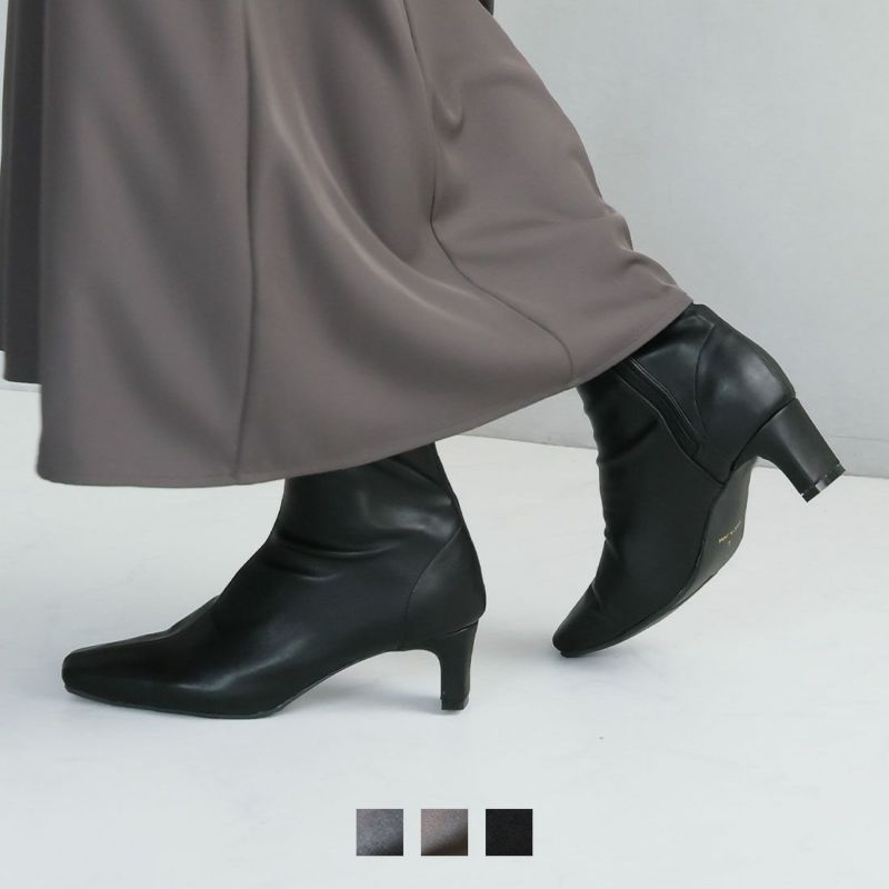 ・細めのスクエアトゥ×プレートヒールで脚をスッキリと見せてシャープさのある大人な美シルエットに。